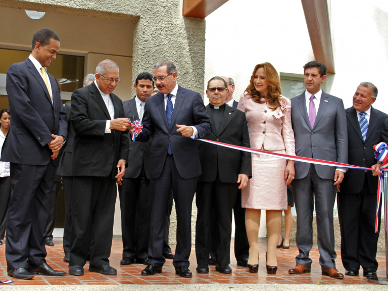 El presidente Danilo Medina entrega un corte de la cinta a monseñor Ramón Benito De la Rosa y Carpio.