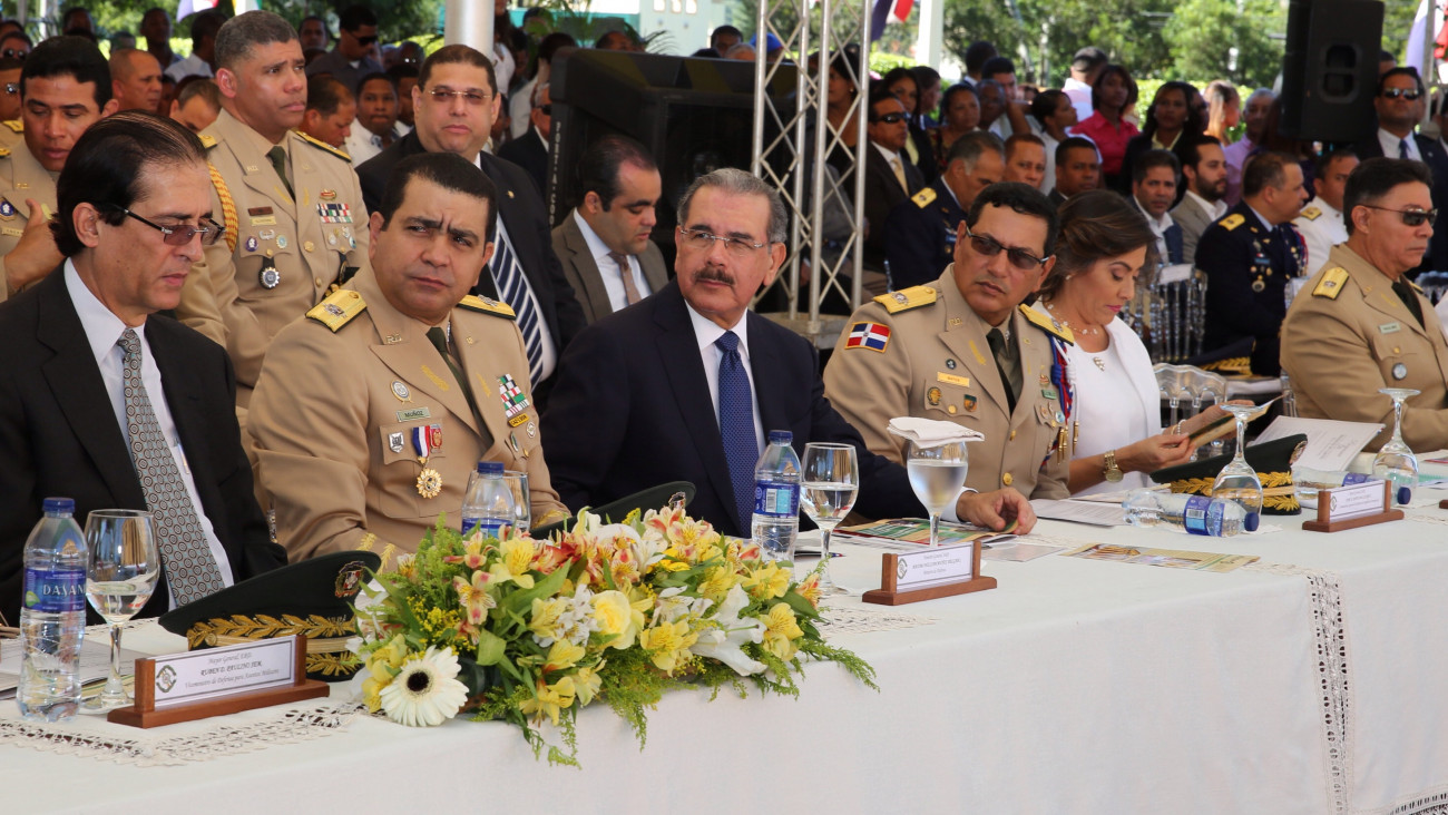 El presidente Danilo Medina encabeza la mesa principal en la graduación de la LIII Promoción de Cadetes "María Trinidad Sánchez" del Ejército de la República Dominicana (ERD). Le acompañan, los ministros de la Presidencia, Gustavo Montalvo; de Defensa, Teniente General Máximo William Muñoz Delgado; entre otras autoridades civiles y militares.