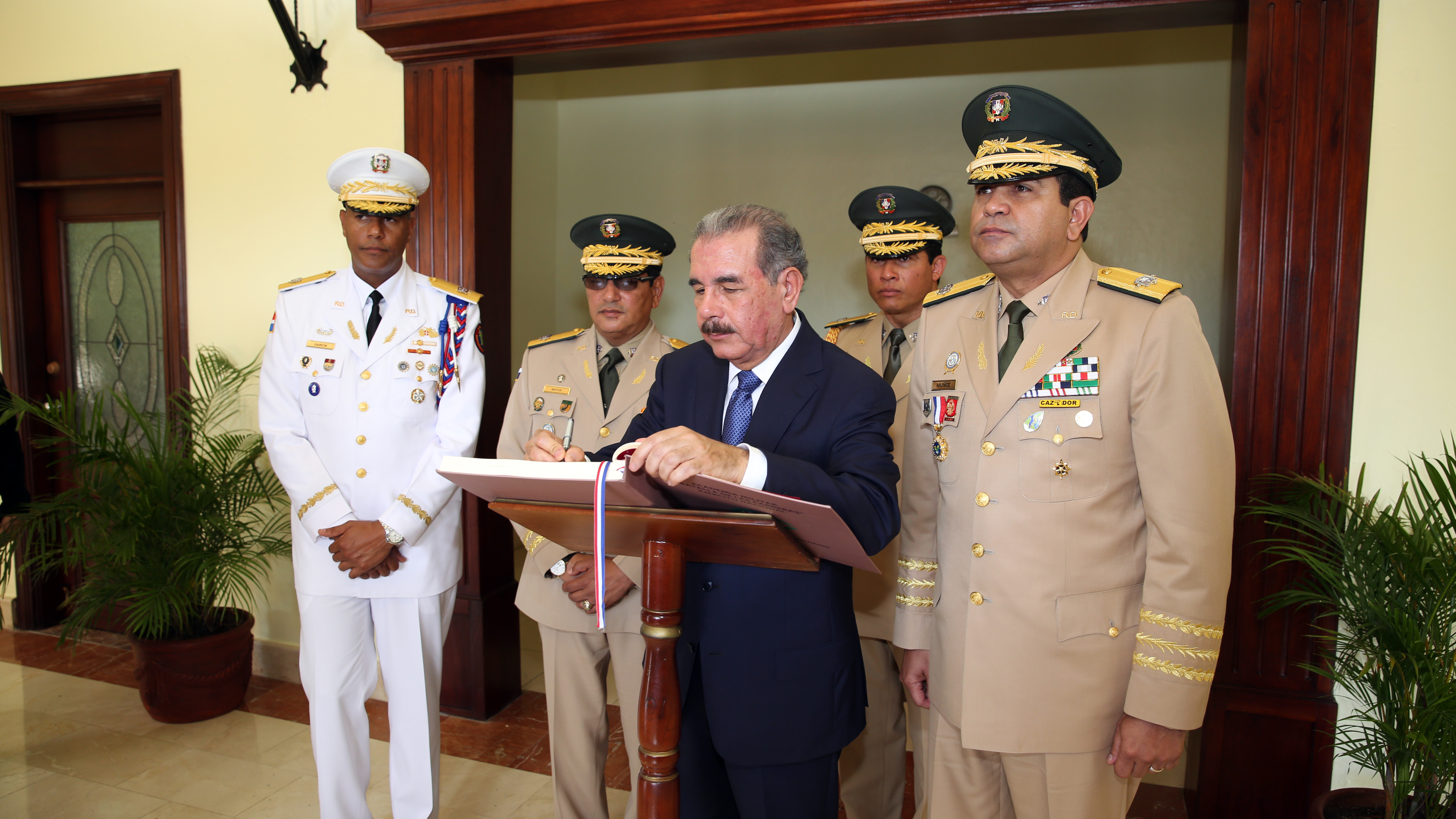 El presidente Danilo Medina firma el libro de Visitantes Distinguidos en la Academia Militar Batalla de Las Carreras, luego de encabezar la graduación de la LIII Promoción de Cadetes "María Trinidad Sánchez" del Ejército de la República Dominicana (ERD).