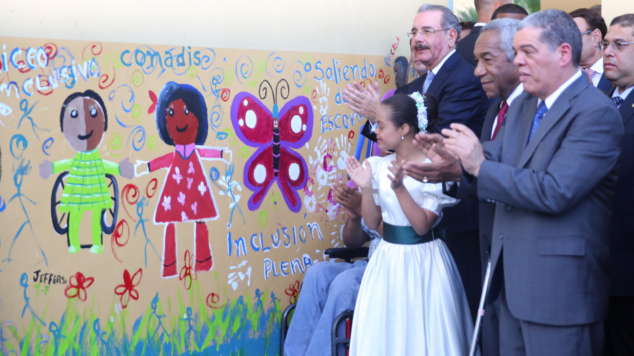 El presidente Danilo Medina develizó un mural de una de las escuelas, pintado por artistas con condiciones especiales.