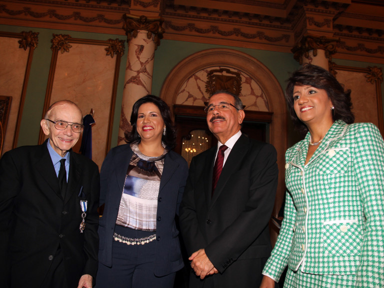El ilustre músico José Antonio Abreu, la vicepresidenta Margarita Cedeño de Fernández, el presidente Danilo Medina y la primera dama, Candida Montilla de Medina, posan para la prensa al final del ceremonial.