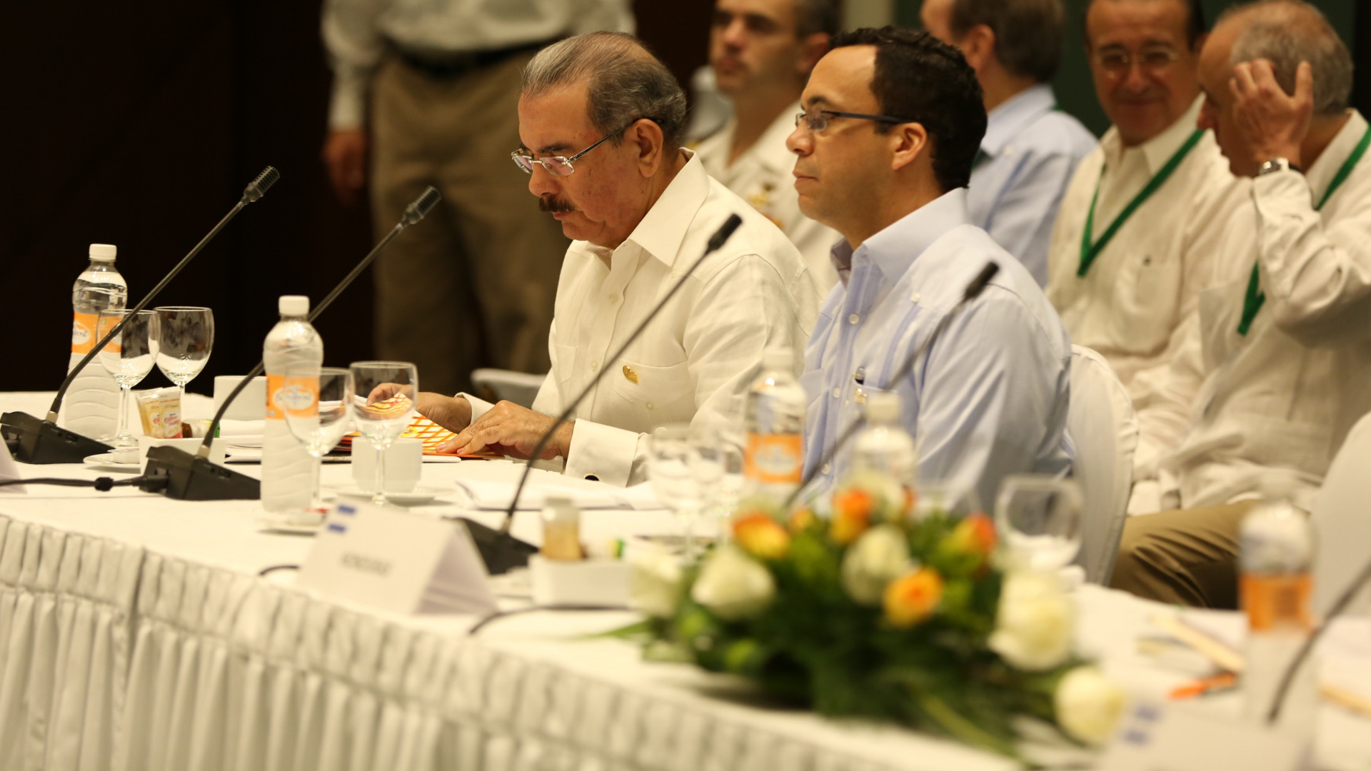 El presidente Danilo Medina y el canciller dominicano Andrés Navarro durante su participación en la reunión de los jefes de Estado del Sistema de la Integración Centroamericana (SICA) con el rey de España, Felipe VI; y el presidente del Gobierno de España, Mariano Rajoy, en el marco de la XXIV Cumbre Iberoamericana en Veracruz, México.
