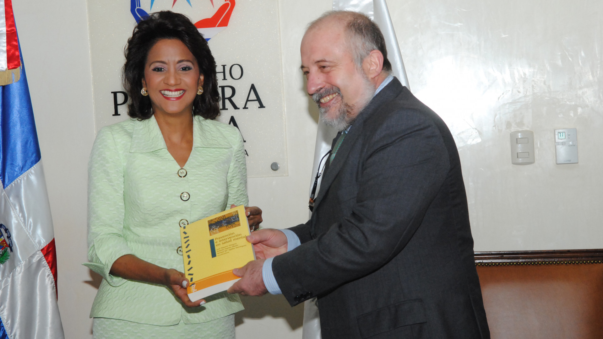La Primera Dama, Cándida Montilla de Medina, recibe de José Navarro Góngora, del Centro Piloto de Estudios Avanzados para el Desarrollo de Programas sobre Familia y Discapacidad de Castellón, España, un libro de su autoría con el título "Prevención e Integración en la Salud Mental".