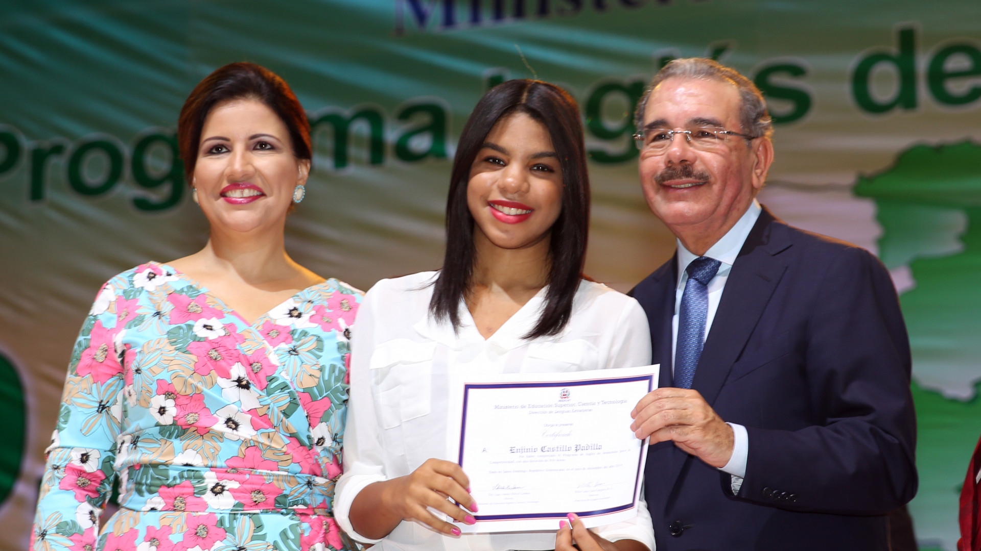 El presidente Danilo Medina entrega certificado a una de las jóvenes egresadas del Programa Inglés de Inmersión para la Competitividad. Le acompaña, la vicepresidenta Margarita Cedeño de Fernández.