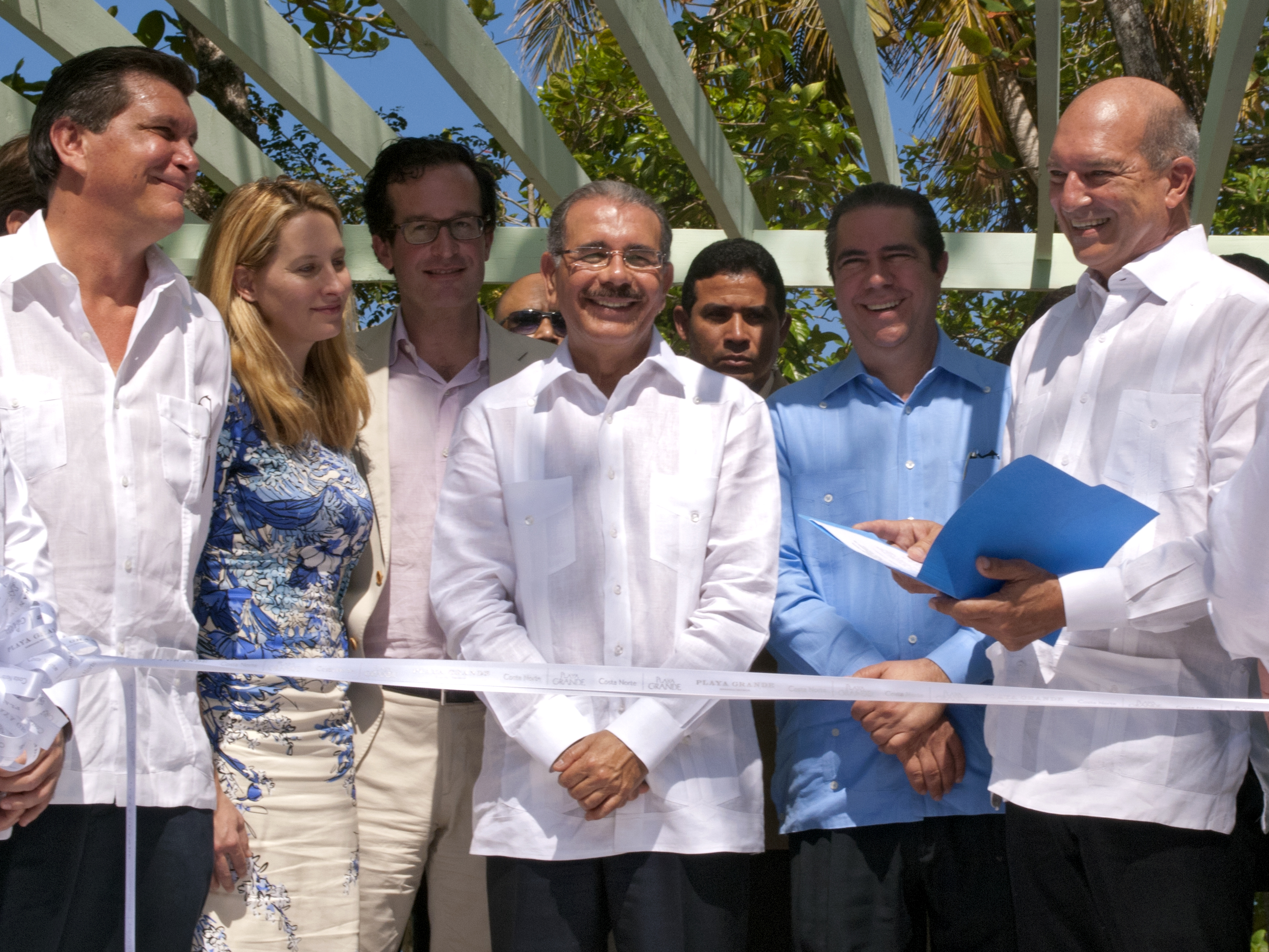 De derecha a izquierda, el destacado modista internacional Oscar de la Renta, el ministro de Turismo, Francisco Javier Garcia, el presidente de la República, Danilo Medina, el presidente de North Shore Land Holdings, Ravenel B. Curry y otros directivos de la empresa, durante la citada actividad.