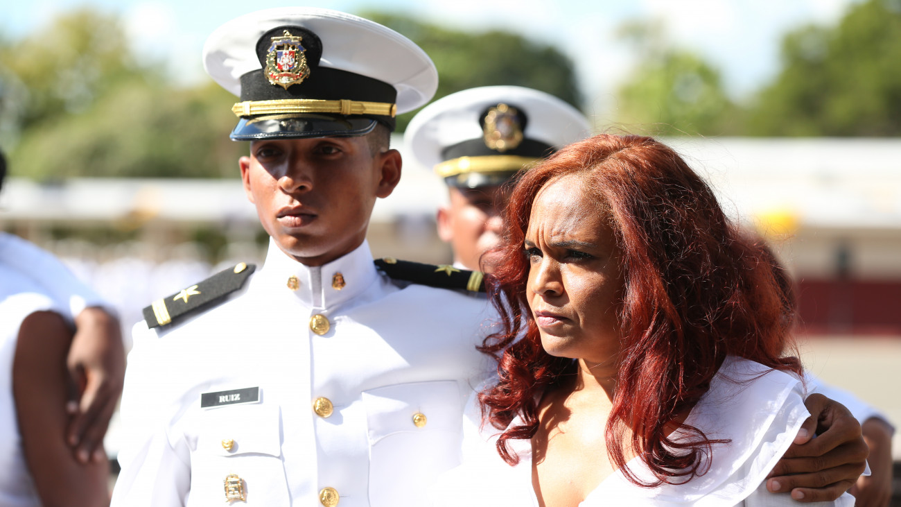 Uno de los nuevos oficiales navales junto a su madre durante el acto de graduación.