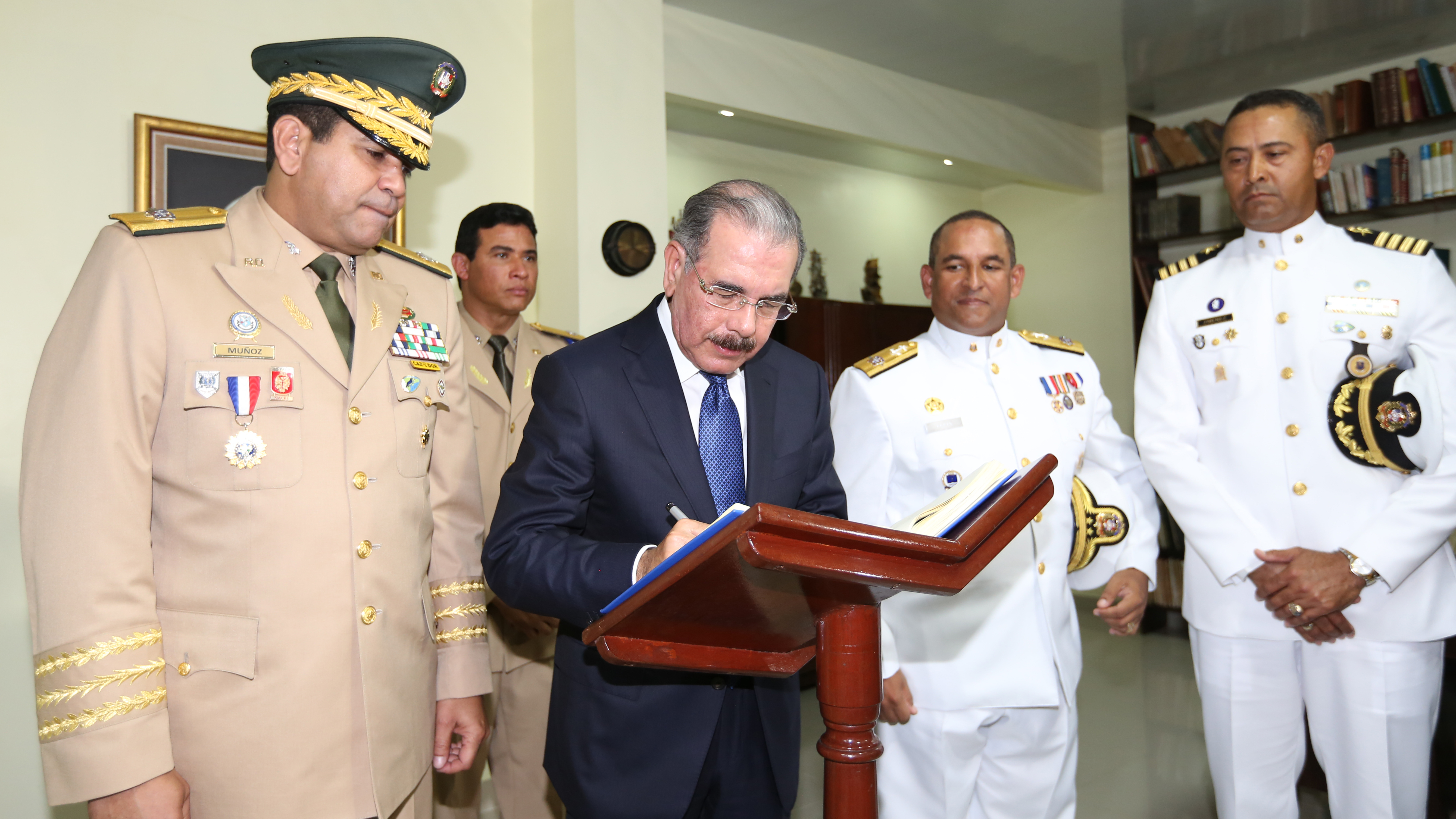 Presidente de la República, Danilo Medina Sánchez, firma el libro de visitantes distinguidos. Le acompañan el Ministro de Defensa, Teniente General Máximo William Muñoz Delgado, el director de la Academia Naval, capitán de navío Samuel Odaris Jiménez Lorenzo, y otros altos mandos militares presentes en el acto de graduación.
