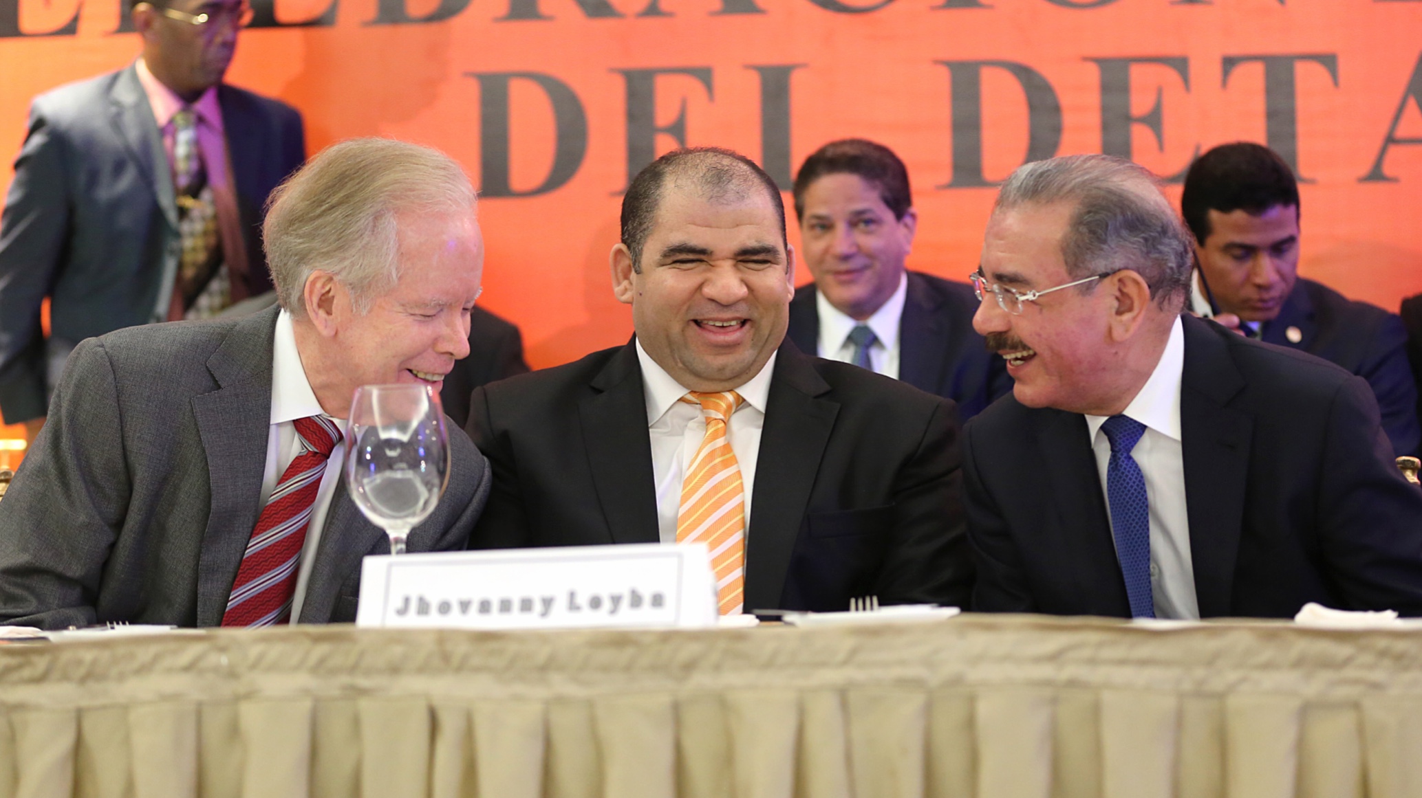 El presidente Danilo Medina junto al los empresarios José Luis Corripio (Pepín) y Jhovanny Leyba.