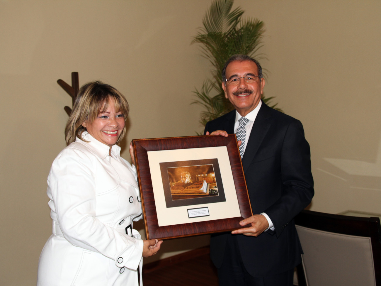 La alcaldesa de San Juan, Hanoi Sánchez, entrega al presidente Danilo Medina una imagen enmarcada del parque "Juan Bosch", en nombre del pueblo de San Juan y en gesto de agradecimiento por el apoyo brindado.