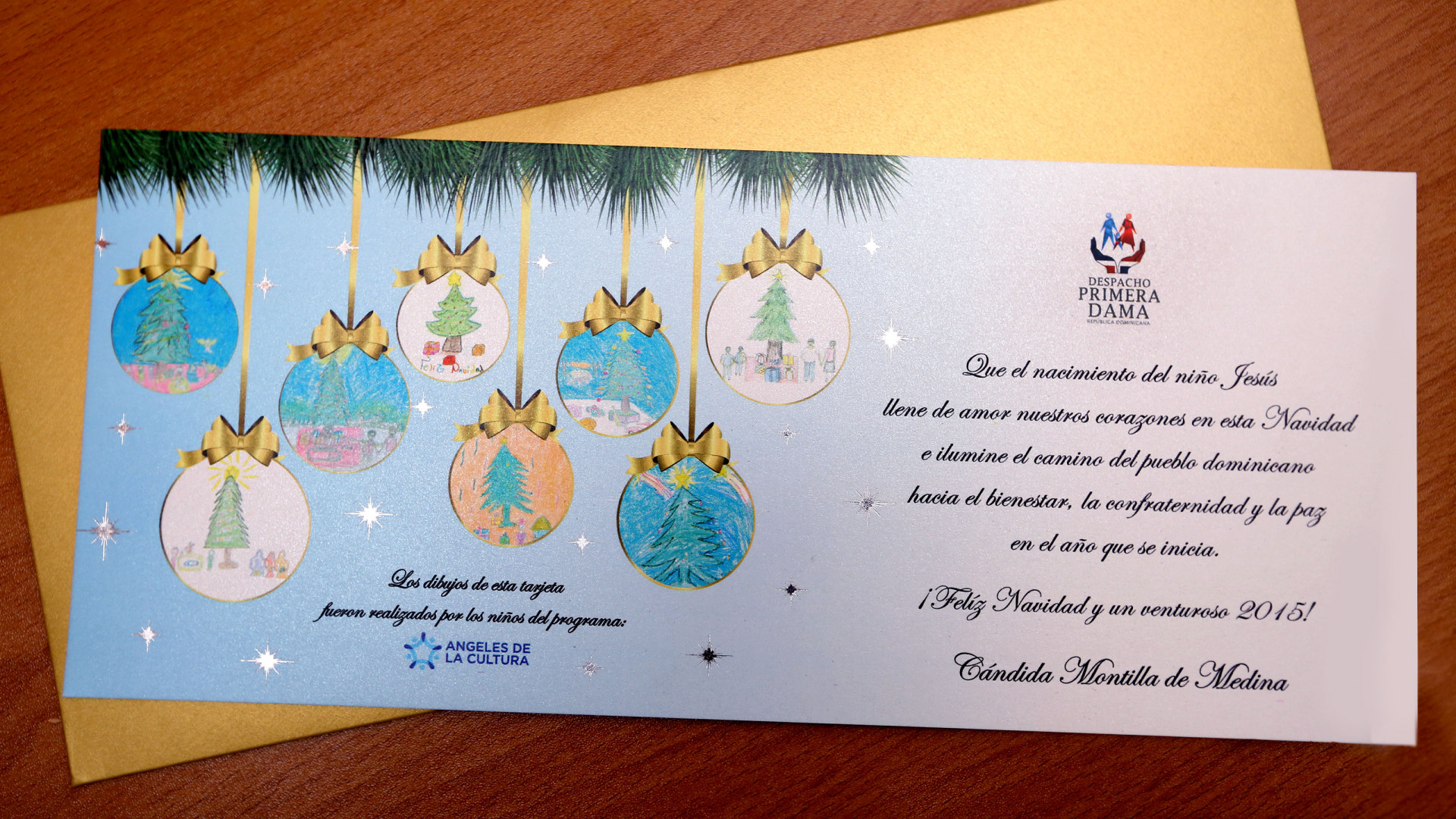 La esposa del Presidente de la República, señora Cándida Montilla de Medina, eligió los trabajos hechos por los niños del programa Ángeles de la Cultura para la creación de las tarjetas de Navidad que envía a familiares, amigos y relacionados de su Despacho.