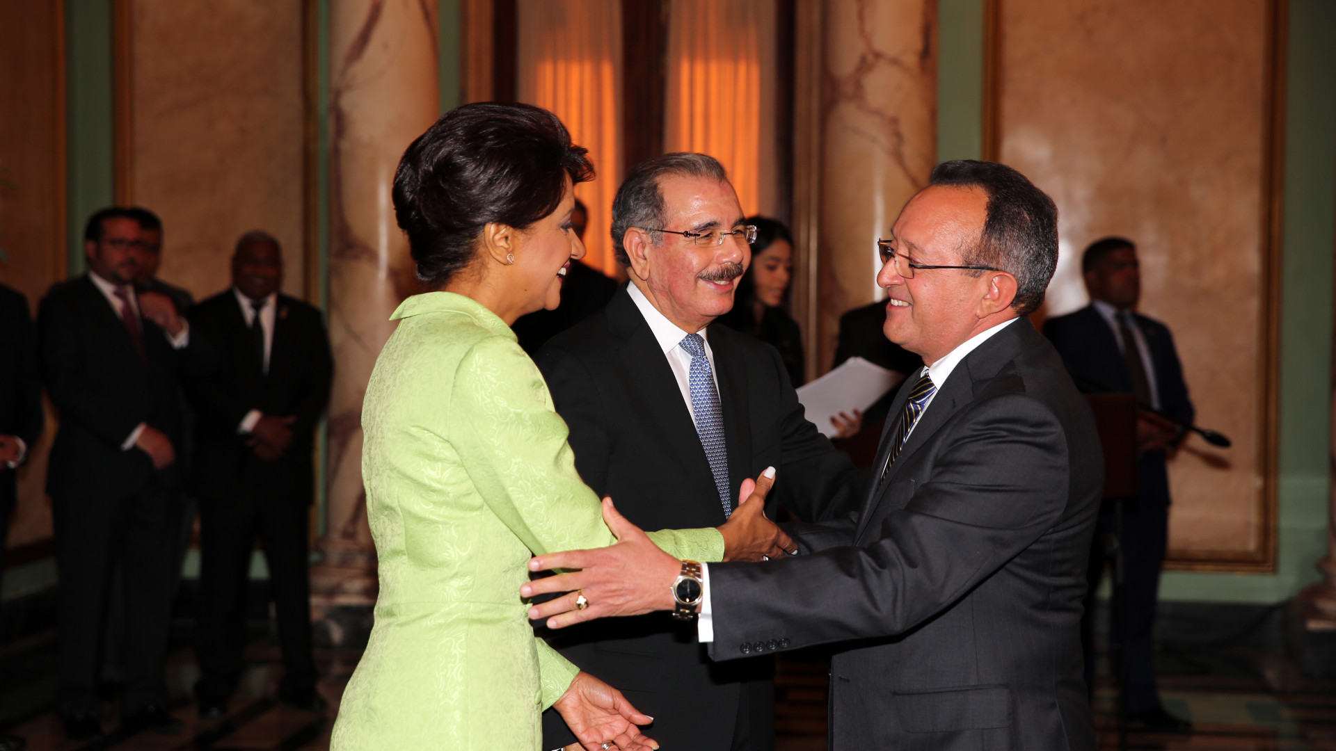 Presidente Danilo Medina y su esposa, señora Cándida Montilla de Medina, durante acto de salutación por motivo del Año Nuevo, efectuado en el Salón de Embajadores del Palacio Nacional.