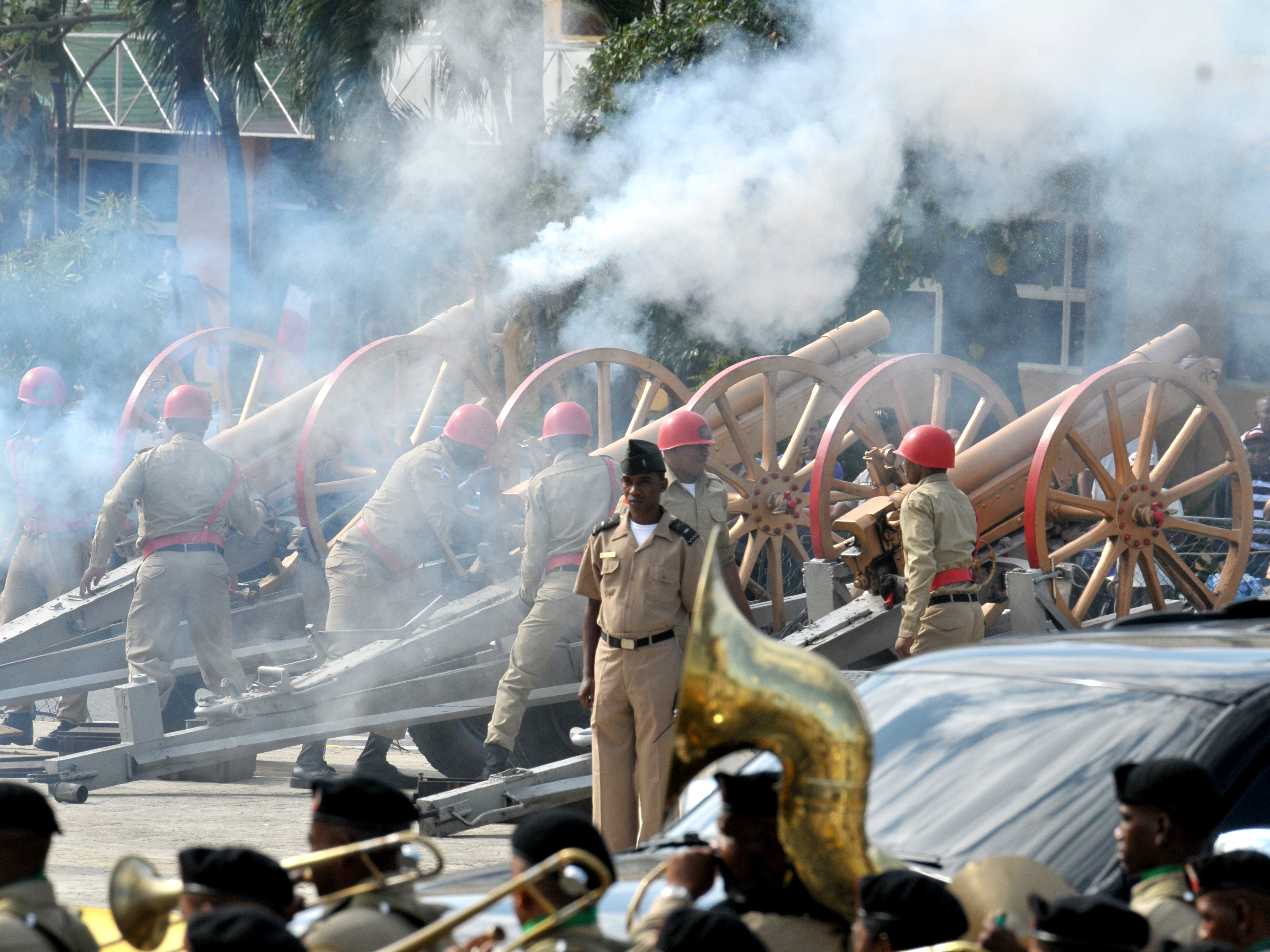 Los cañones mientras disparan las salvas que acompañan las notas del Himno Nacional, previo al inicio de la Rendición de Cuentas del presidente Danilo Medina en el Congreso Nacional, y en el 169 aniversario de la Independencia Nacional.