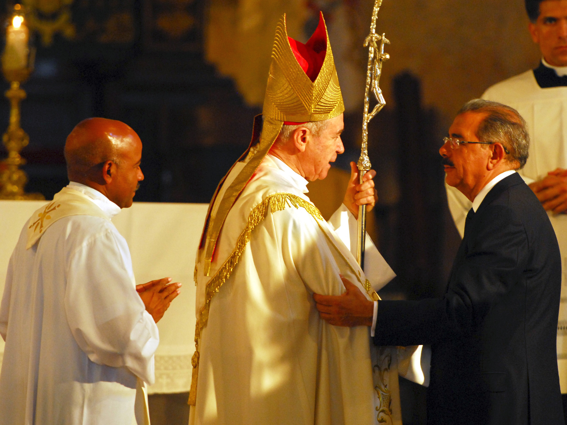 El cardenal Nicolás de Jesús López Rodríguez saluda al presidente Danilo Medina luego de Eucaristía.
