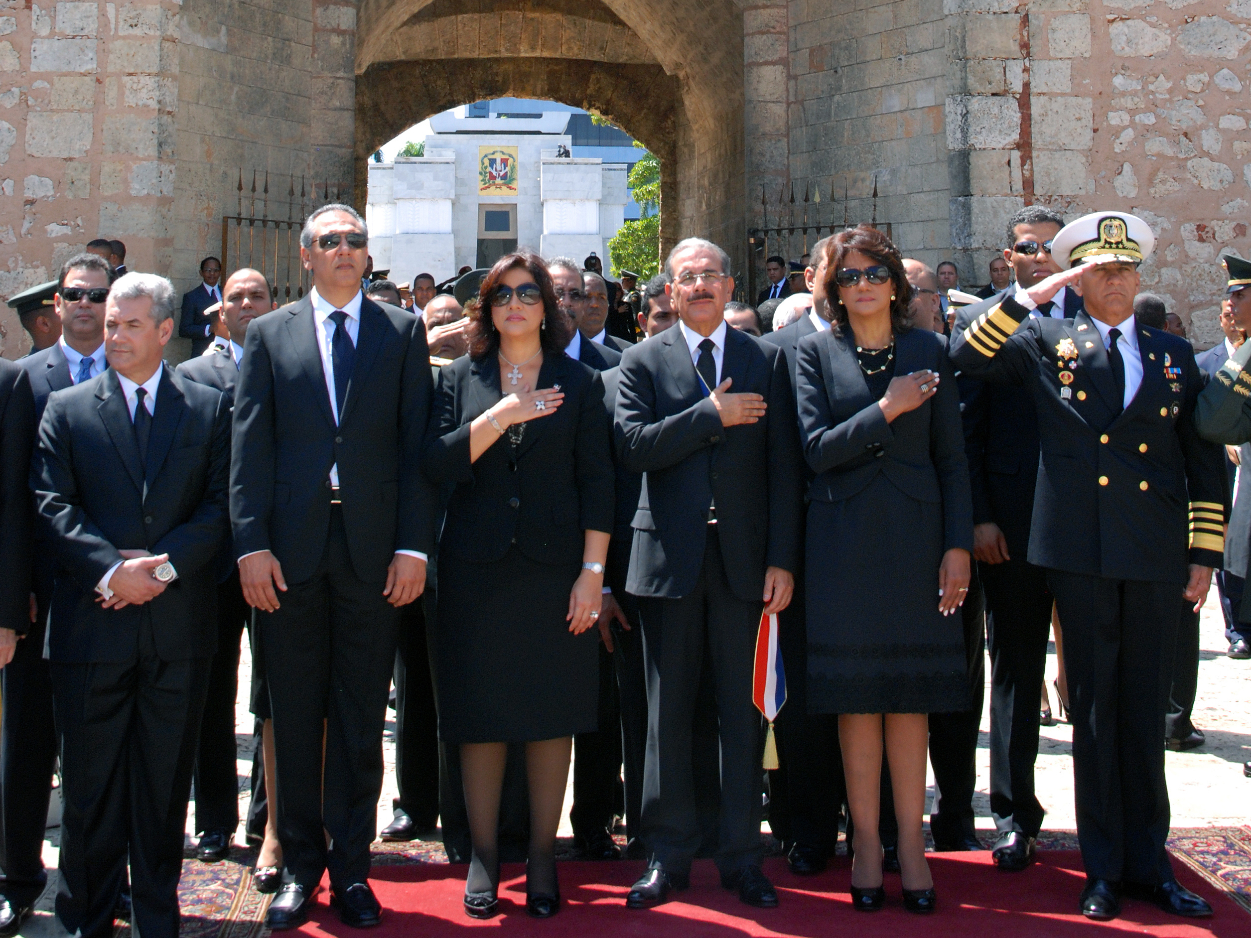 Los cuerpos del orden rinden los honores militares de estilo correspondientes a la investidura del Presidente de la República. Acompañan al mandatario Danilo Medina, la vicepresidenta Margarita Cedeño de Fernández, la primera dama Cándida Montilla de Medina, funcionarios y autoridades civiles y militares en la Puerta del Conde.