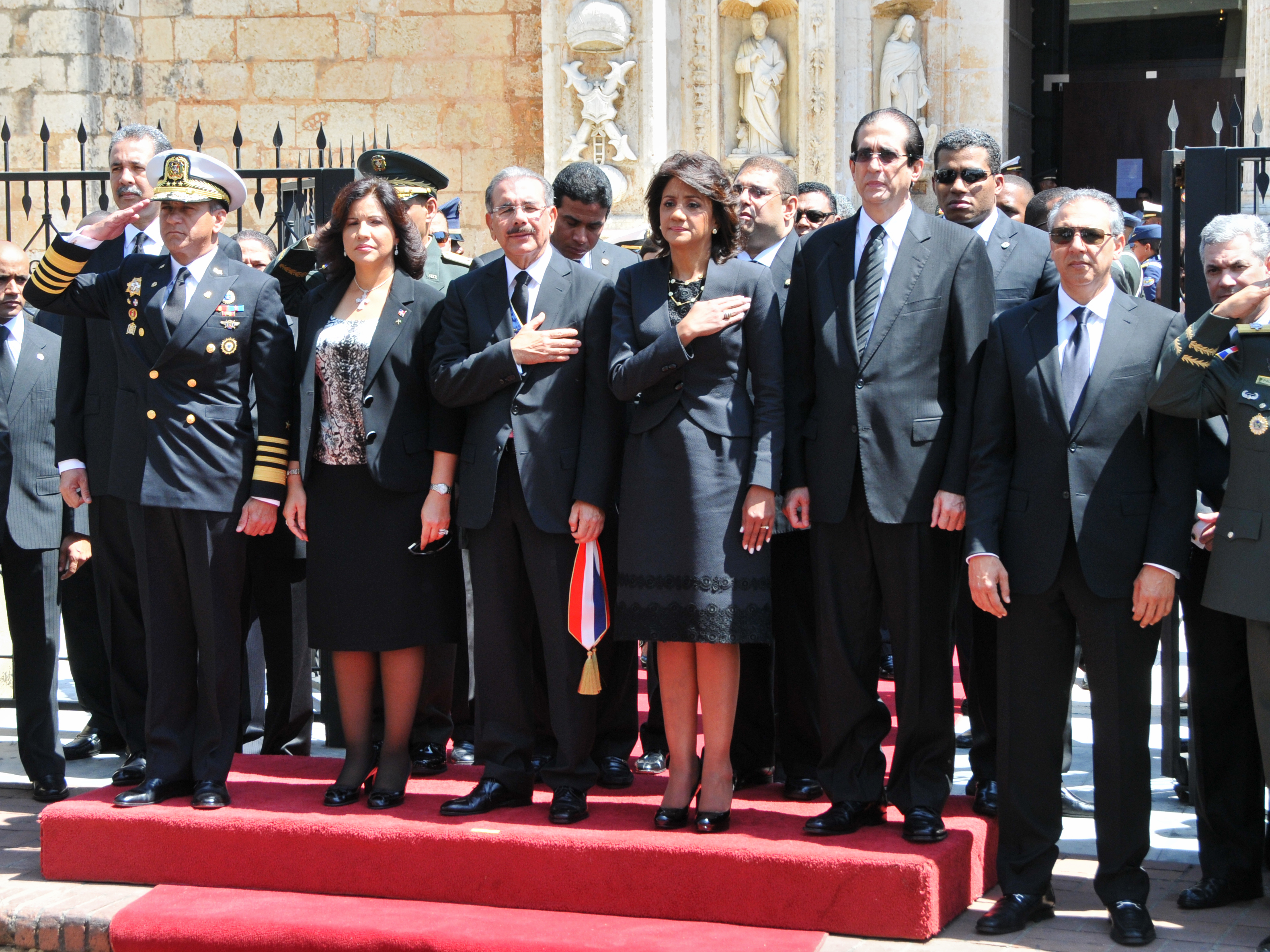 A su llegada a la Catedral, el presidente Danilo Medina recibido con los honores militares de estilo correspondientes a su investidura. Le acompañan, la vicepresidenta Margarita Cedeño de Fernández, la primera dama, Cándida Montilla de Medina, funcionarios y autoridades civiles y militares.