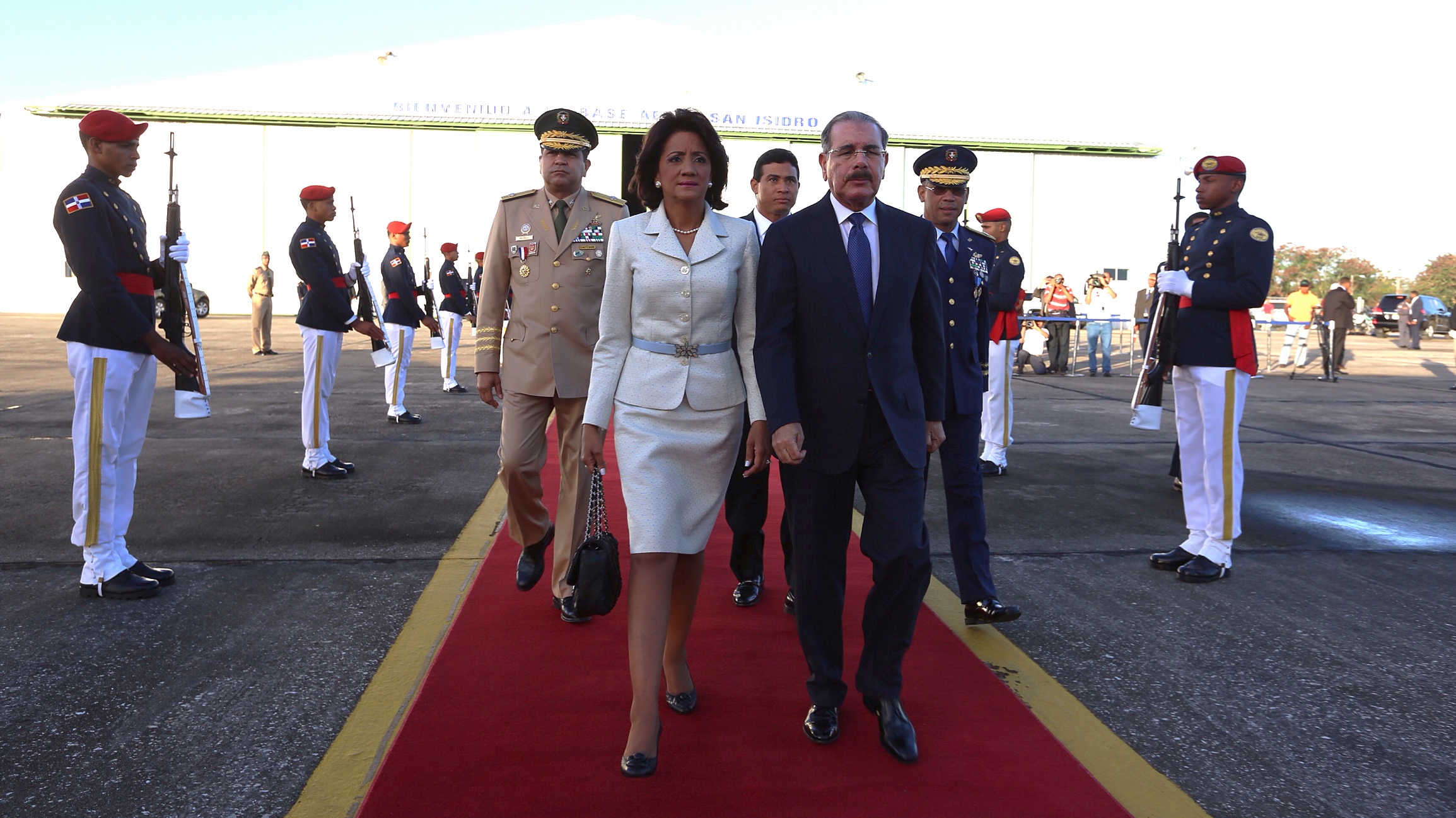 Presidente Danilo Medina acompañado de su esposa, señora Cándida Montilla de Medina, durante su salida del país por la Base Aérea de San Isidro en ocasión del viaje oficial a Puerto Rico para oficializar los acuerdos alcanzados con nuestra isla.