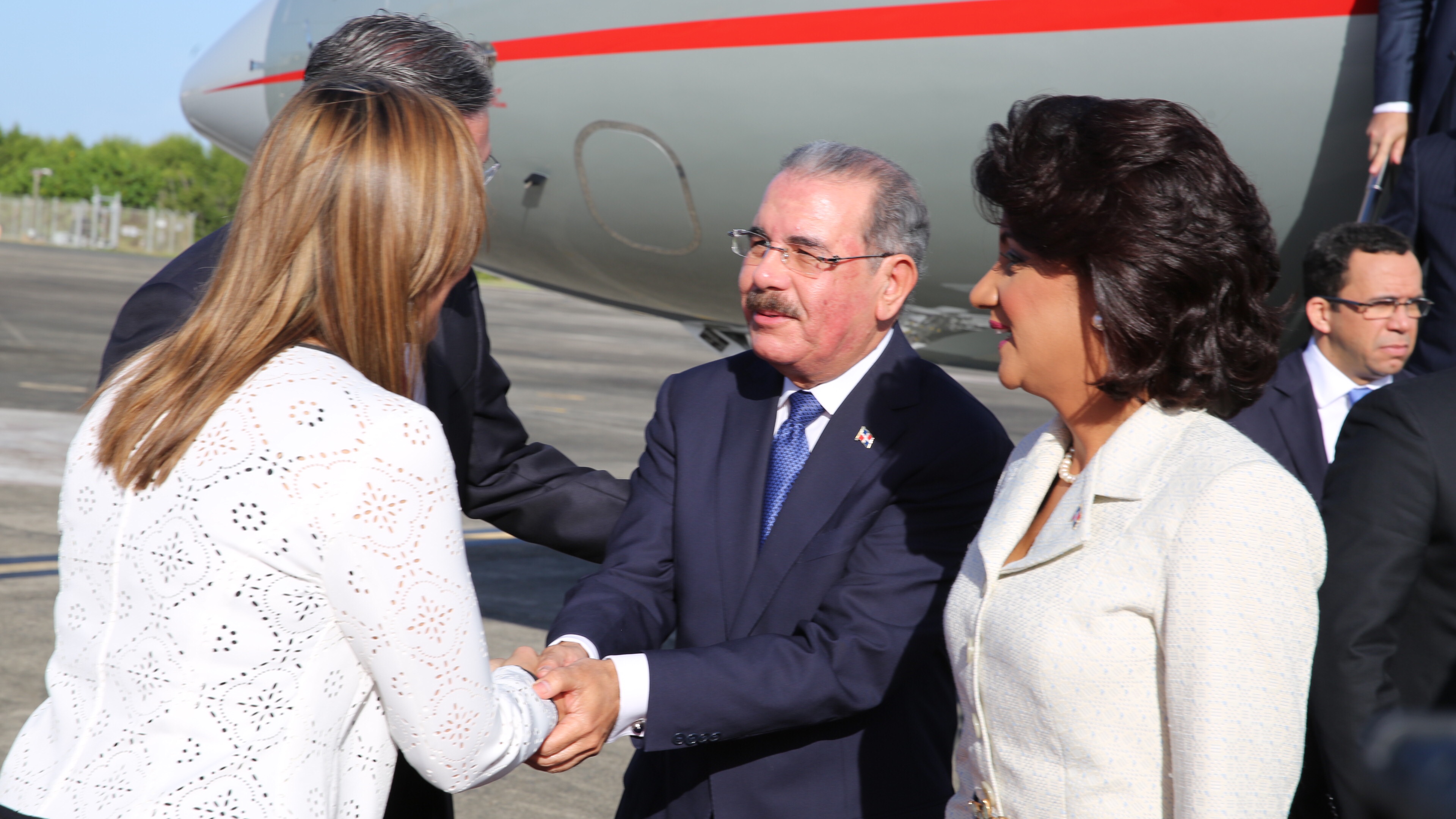 A su arribo a la Base Aérea Muñiz en Carolina, el presidente Danilo Medina junto a su esposa señora Cándida Montilla de Medina y la delegación de ministros del Estado, fueron recibidos por el gobernador Alejandro García Padilla y su esposa, señora Wilma Pastrana Jiménez.