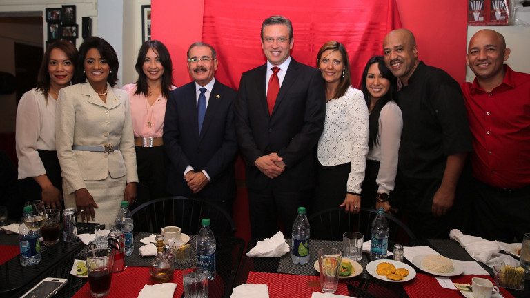 Presidente Medina y su esposa, señora Cándida Montilla de Medina, durante almuerzo en restaurante de comida dominicana, acompañados por el gobernador García Padilla, su esposa e invitados.