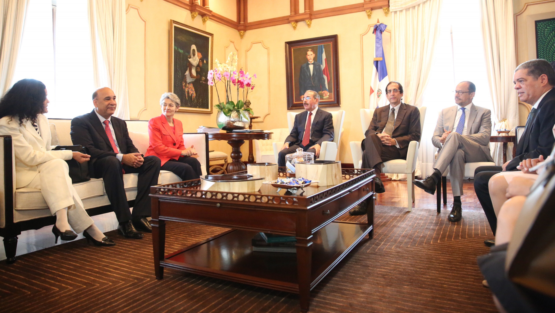 Estuvieron presentes en la reunión, el ministro de la Presidencia, Gustavo Montalvo; el ministro de Cultura, José Antonio Rodríguez; el ministro de Educación, Carlos Amarante Baret; ministro de Medio Ambiente y Recursos Naturales, Bautista Rojas Gómez; y ministra de Educasión Superior, doña Ligia Melo. A la diplomática la acompañaron Fernando Brugman, Oficial a Cargo y Coordinador del Equipo de Cultura de la UNESCO, la embajadora dominicana represente ante esa entidad, Laura Faxas y María Mercedes Brito, secretaria general de la UNESCO.