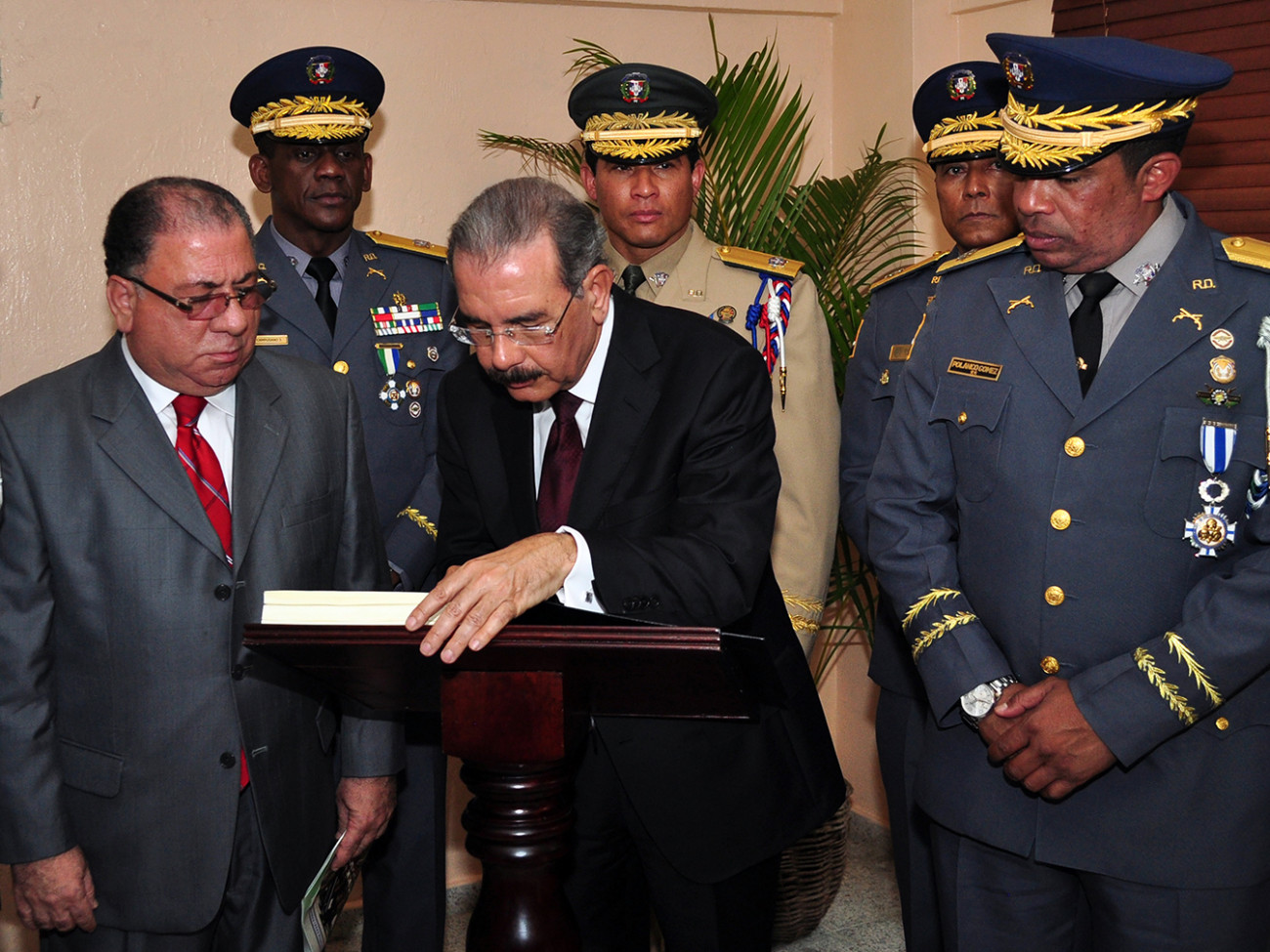 Luego de concluido el acto, el presidente Danilo Medina firmó el libro de visitas de la Academia de Cadetes 2 de Marzo.