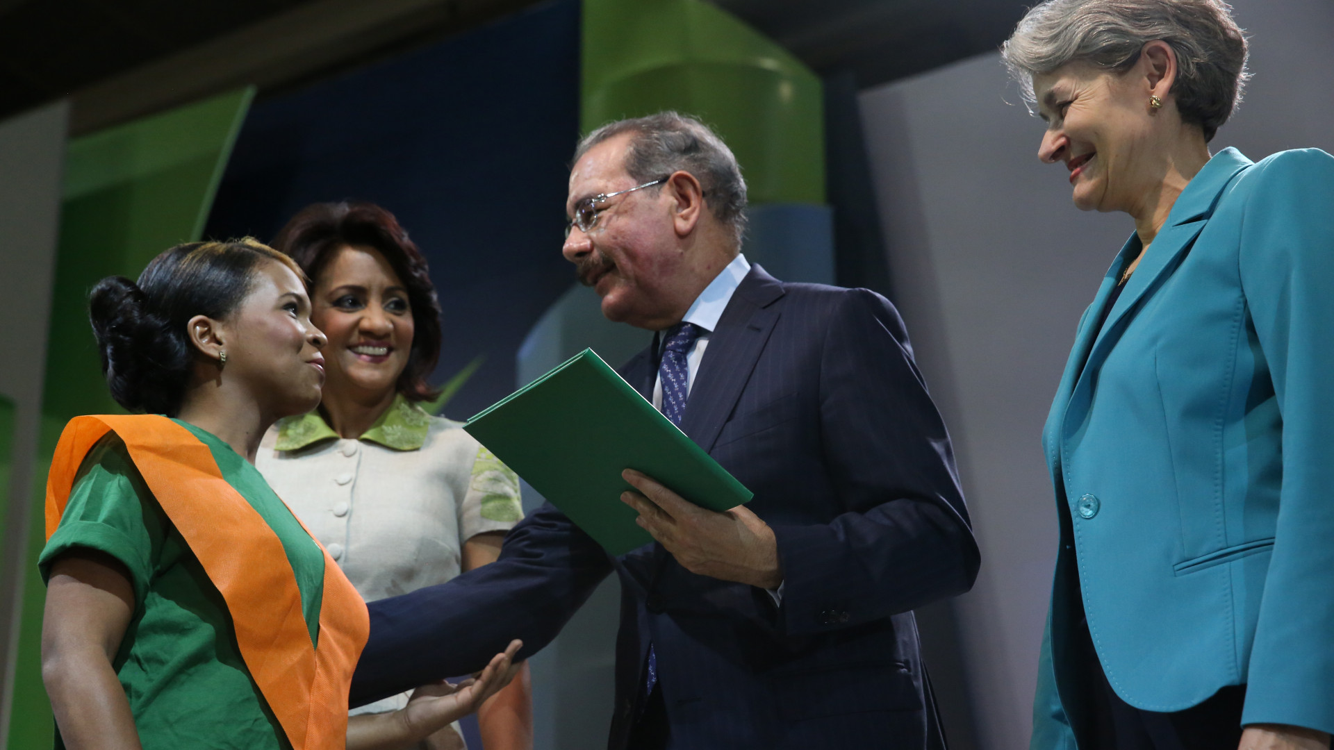 El presidente Danilo Medina entrega certificado de graduación a una de las alfabetizadas. Le acompañan, la primera dama Cándida Montilla de Medina y la directora de la UNESCO, Irina Bokova.