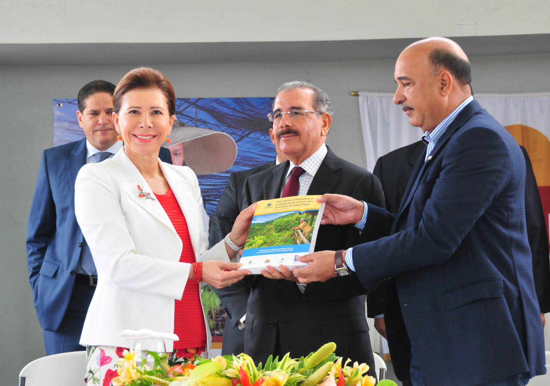 El presidente Danilo Medina recibió una copia del Plan Maestro Actualizado de manos de la señora Melba Segura de Grullón, presidenta de la Fundación Sur Futuro; y Bautista Rojas Gómez, ministro de Medio Ambiente.