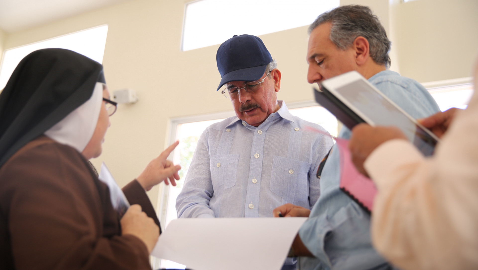 Presidente Danilo Medina mientras escucha hermanas del Monasterio Carmelita Nuestra Señora de América y San José, durante su visita a Santiago Rodríguez.