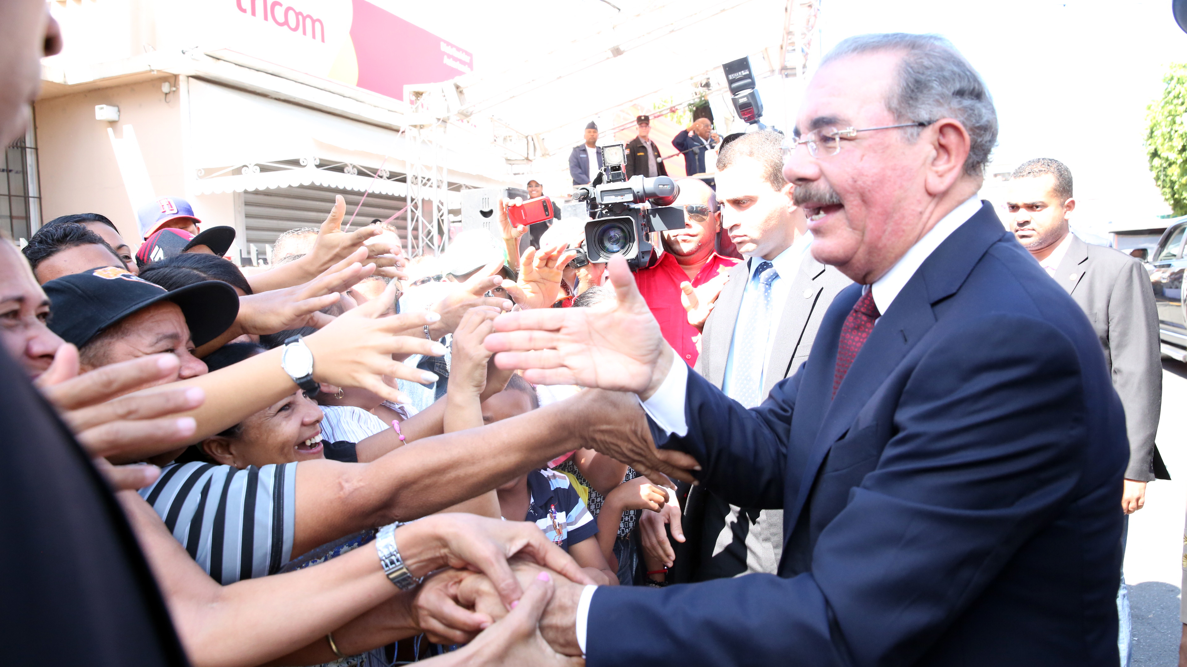 El presidente Danilo Medina saluda al público a su llegada al desfile militar en conmemoración del 202 aniversario del natalicio de Juan Pablo Duarte.