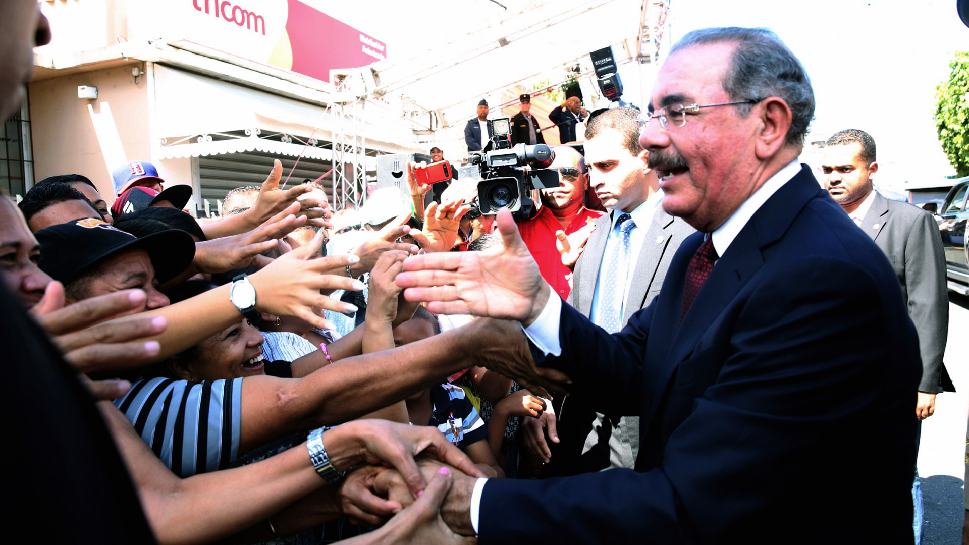 El presidente Danilo Medina saluda al público a su llegada al desfile militar en conmemoración del 202 aniversario del natalicio de Juan Pablo Duarte.