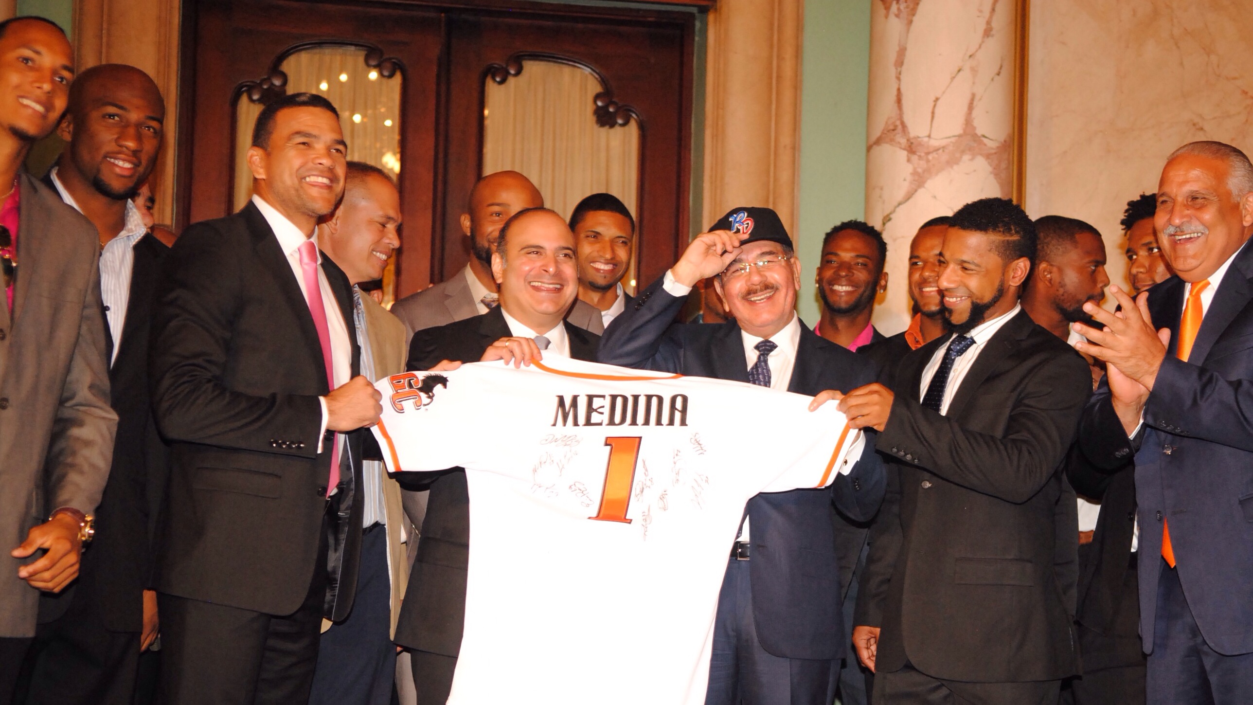 El presidente Medina recibe camiseta y gorra del equipo Gigantes del Cibao SFM, ganador del Campeonato de Béisbol Profesional Dominicano 2014 – 2015, representarán al país en Serie del Caribe.