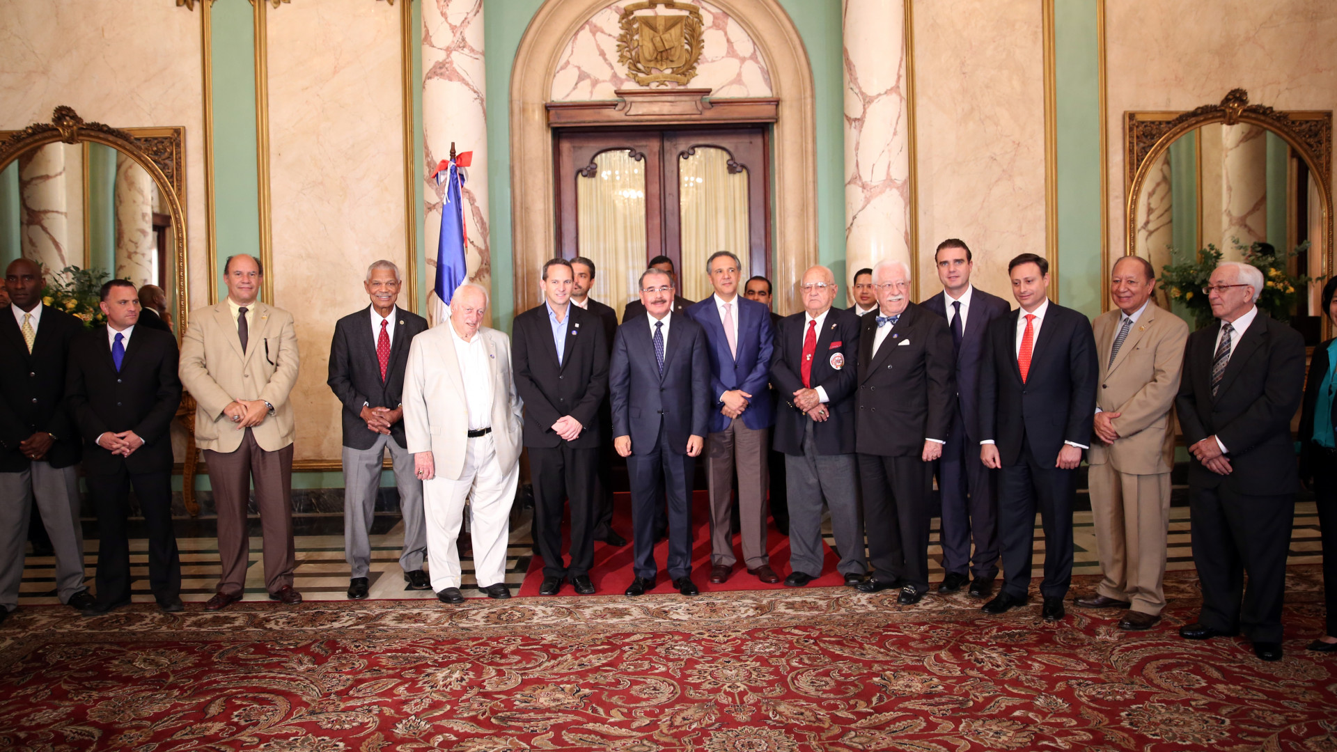 Presidente Danilo Medina acompañado de la nutrida delegación de altos ejecutivos del Salón Béisbol Latino y MLB, encabezada por el comisionado del béisbol de las Grandes Ligas, Rob Manfred, en el Salón de Embajadores del Palacio Nacional.