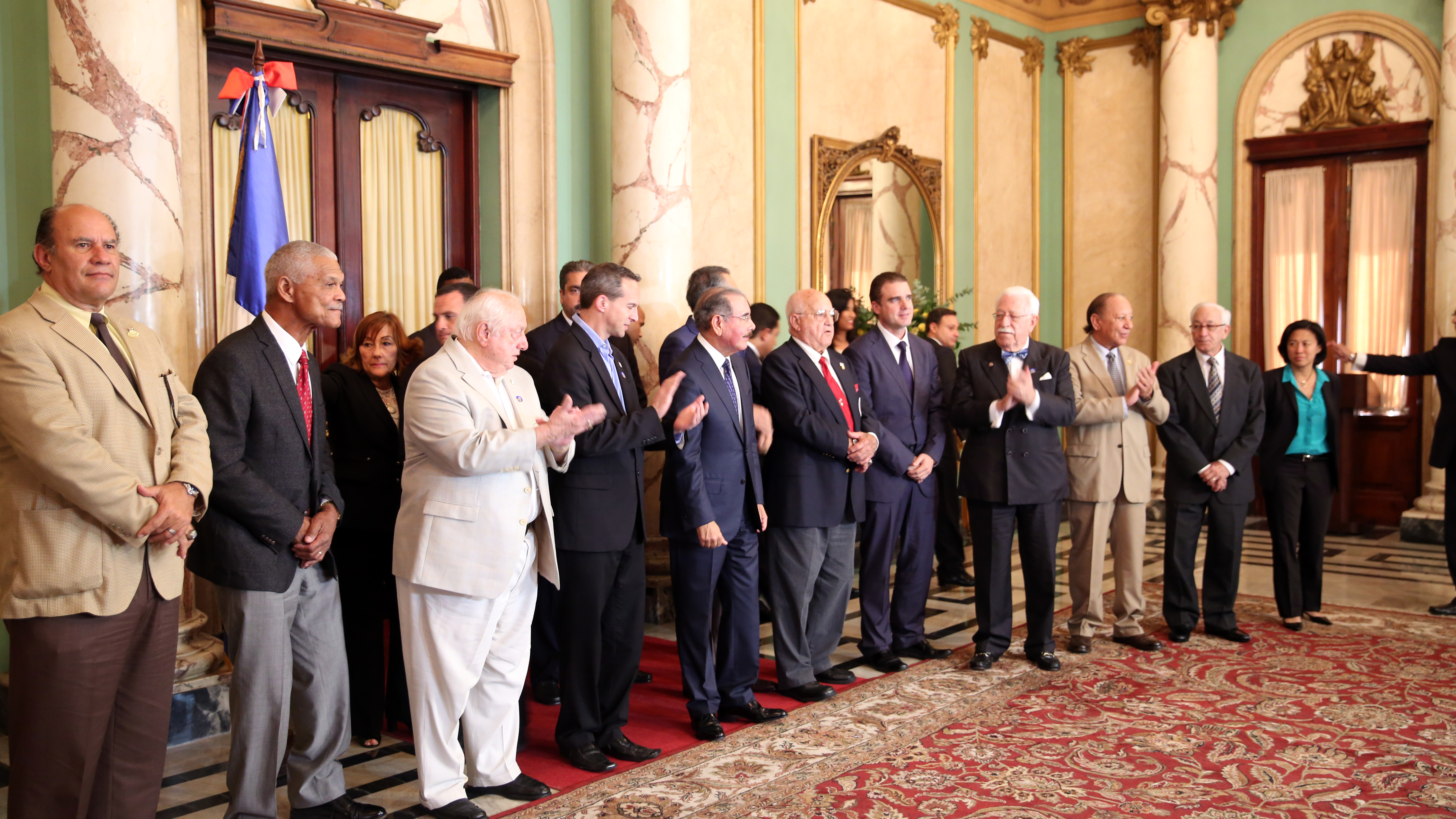 Presidente Danilo Medina acompañado de la nutrida delegación de altos ejecutivos del Salón Béisbol Latino, encabezada por el comisionado del béisbol de las Grandes Ligas, Rob Manfred y Tom Lasorda, entre otros.