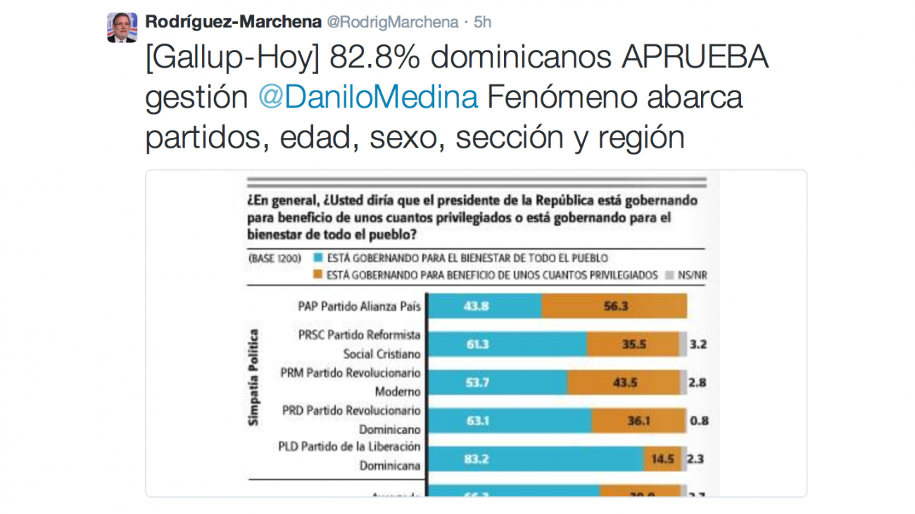 Reseña de encuesta Gallup publicada por el periódico Hoy, la cual revela que el 82.8% de los dominicanos aprueba la gestión de gobierno del presidente de la República, Danilo Medina Sánchez, fenómeno que abarca partidos, edad, sexo, sección y región.