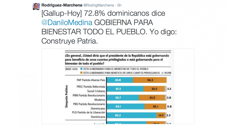 Así mismo, el 72.8% de los dominicanos entiende que el presidente Medina gobierna para el bienestar de todo el pueblo.