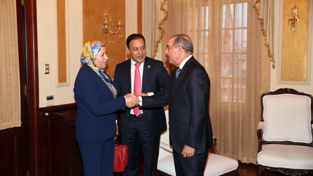 Presidente de la República, Danilo Medina mientras saluda a la señora El Ghali, vicepresidenta de la Cámara de Representantes del Parlamento del Reino de Marruecos, durante visita de cortesía acompañada de otros representantes del FOPREL.