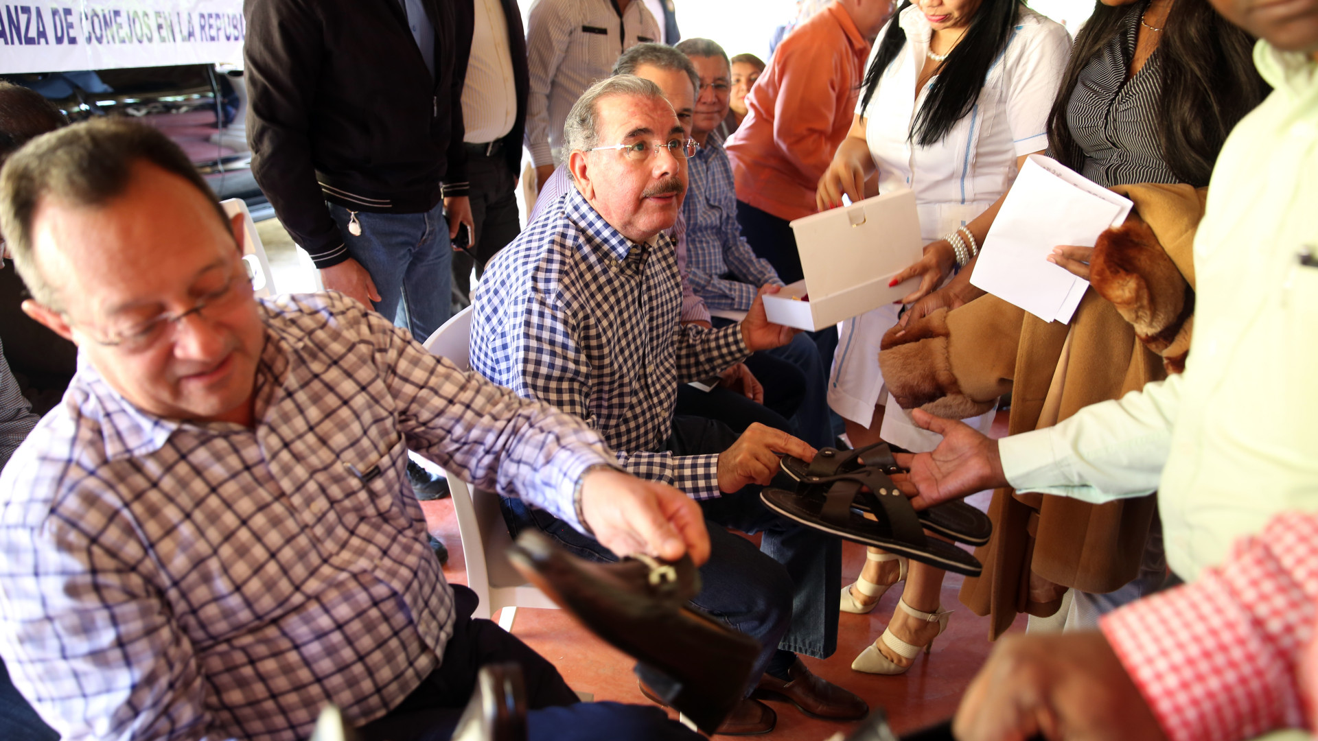 El ministro de Agricultura mientras junto al presidente Medina observan calzados producidos por integrantes de ADOCU.