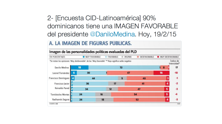 Resultados de encuesta de la Consultoría Interdisciplinaria en Desarrollo (CID)-Latinoamérica, presenta que un 90% de dominicanos tienen una imagen favorable del presidente Danilo Medina, periódico Hoy, 19 de febrero de 2015.