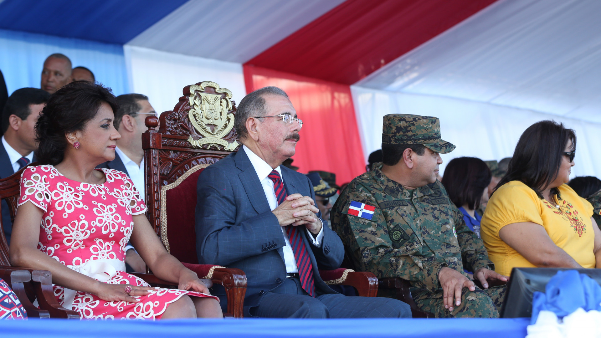 La esposa del Presidente, Cándida Montilla de Medina, el presidente Danilo Medina, el ministro de Defensa, teniente general Máximo William Muñoz y esposa, presentes durante el desfile militar realizado en la avenida George Washington, de esta Capital.