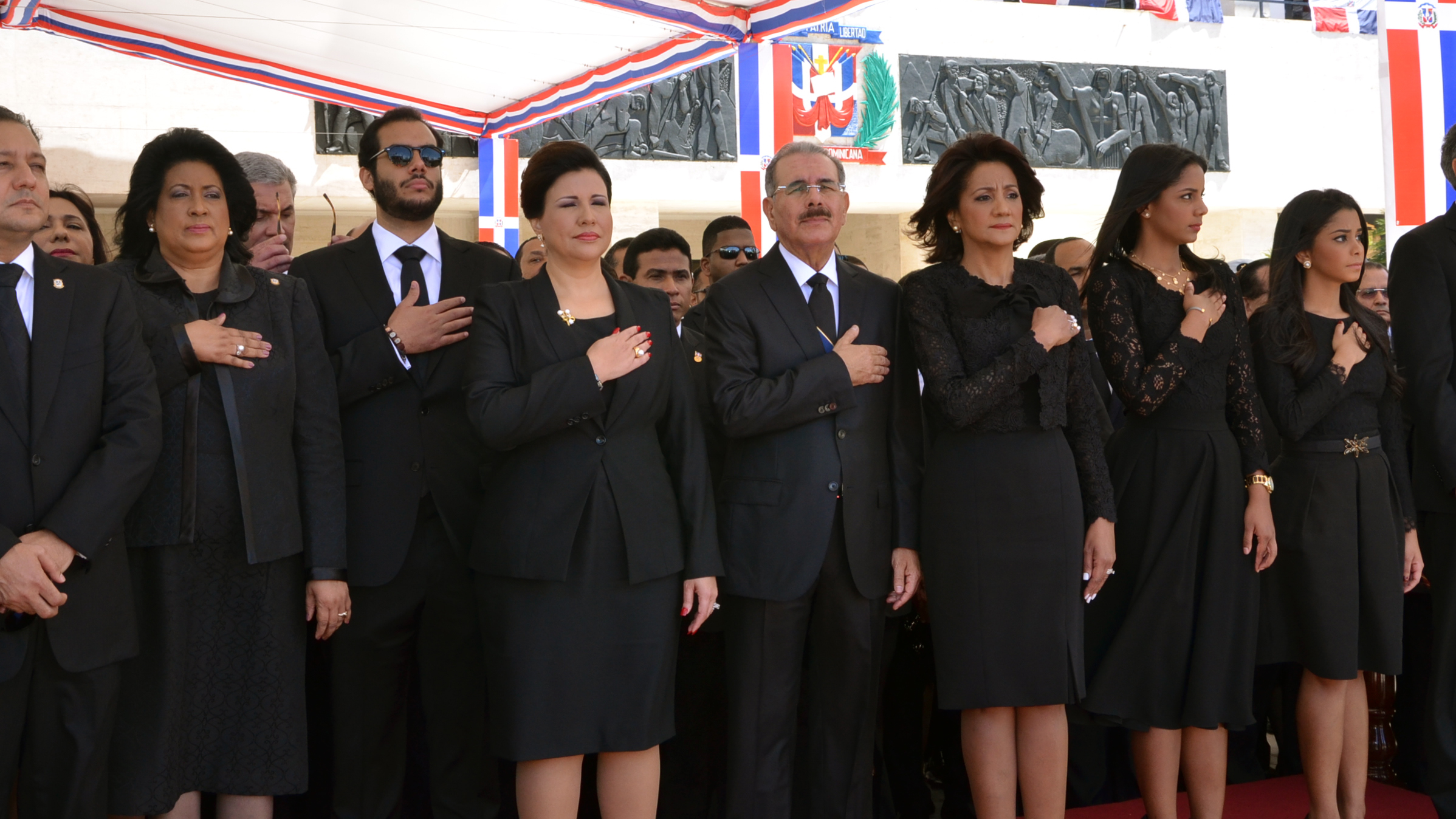 Presidente Danilo Medina, junto a su esposa, Cándida Montilla de Medina y la vicepresidenta Margarita Cedeño de Fernández, acompañados de la presidenta del Senado, Cristina Lizardo, al recibir los honores militares a su llegada al Congreso Nacional.