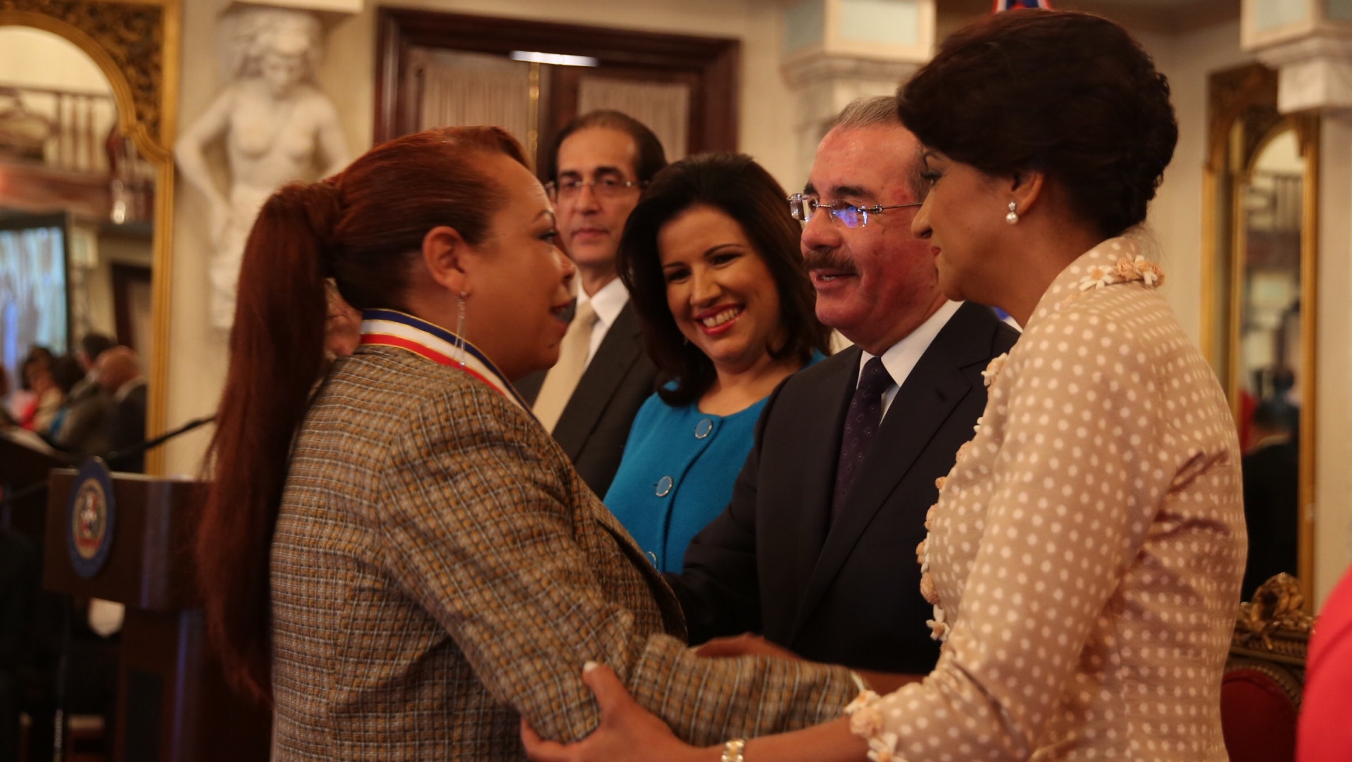 Señora Rosa Ayala: Medalla al Mérito en el renglón Labor Comunitaria en el extranjero, al momento de ser felicitada por el presidente Medina y su esposa.