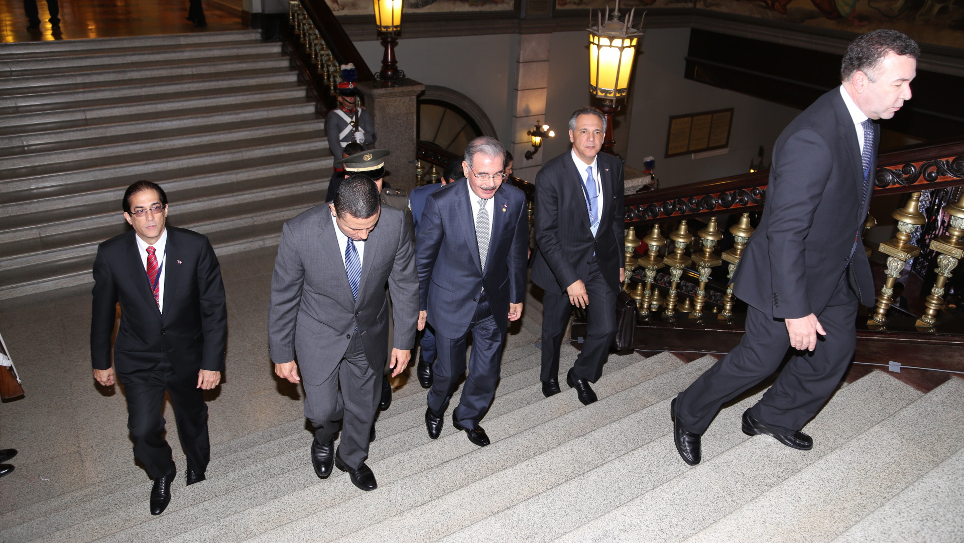 El presidente Danilo Medina y delegación dominicana, durante su llegada al Palacio Nacional de la Cultura, sede de la XLV Cumbre del SICA - España, que se celebró en la República de Guatemala.