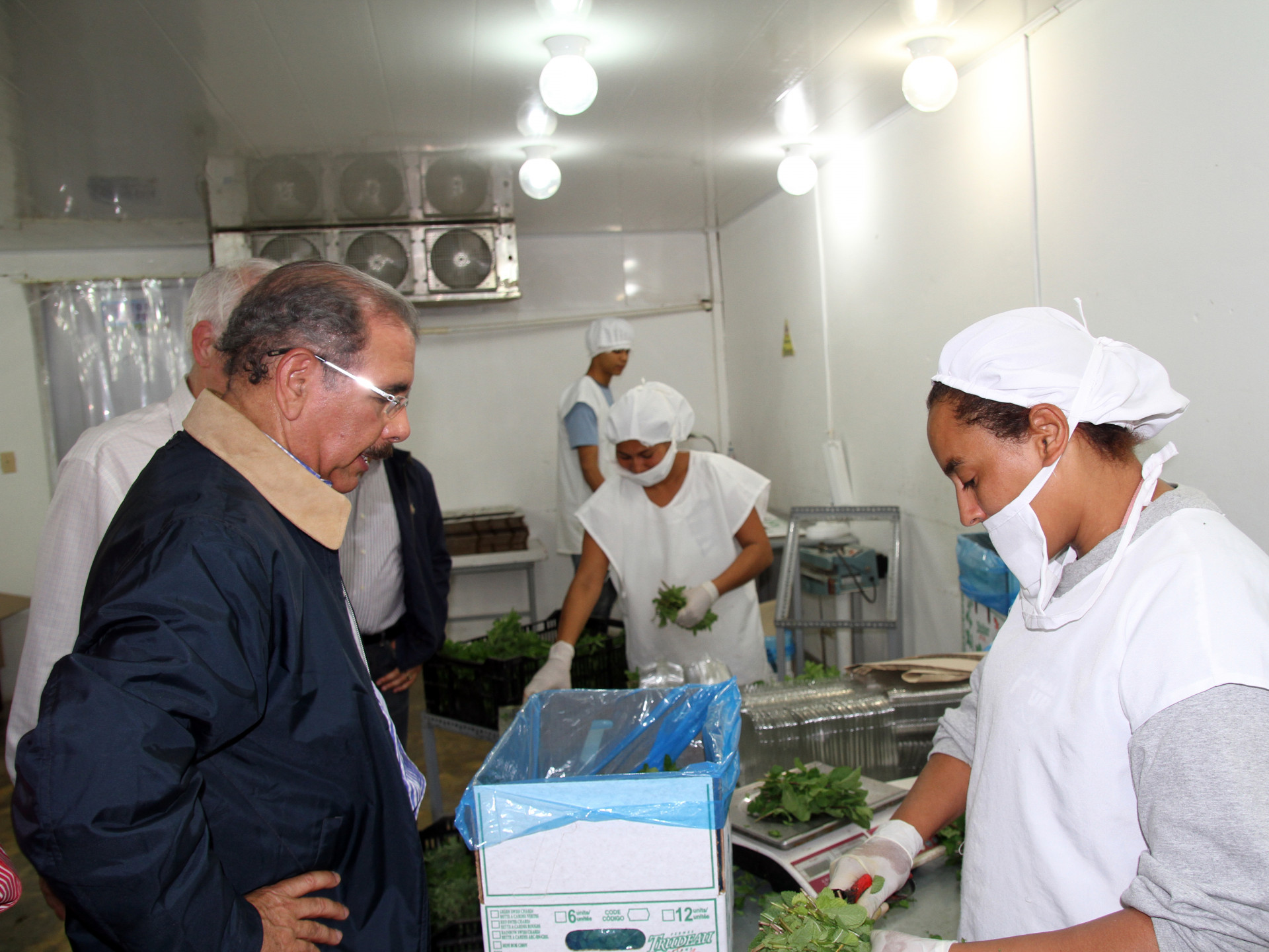 El mandatario Danilo Medina observa que luego de la cosecha, en Flores de Jarabacoa, se empacan las hierbas aromáticas que serán exportadas hacia Canadá.