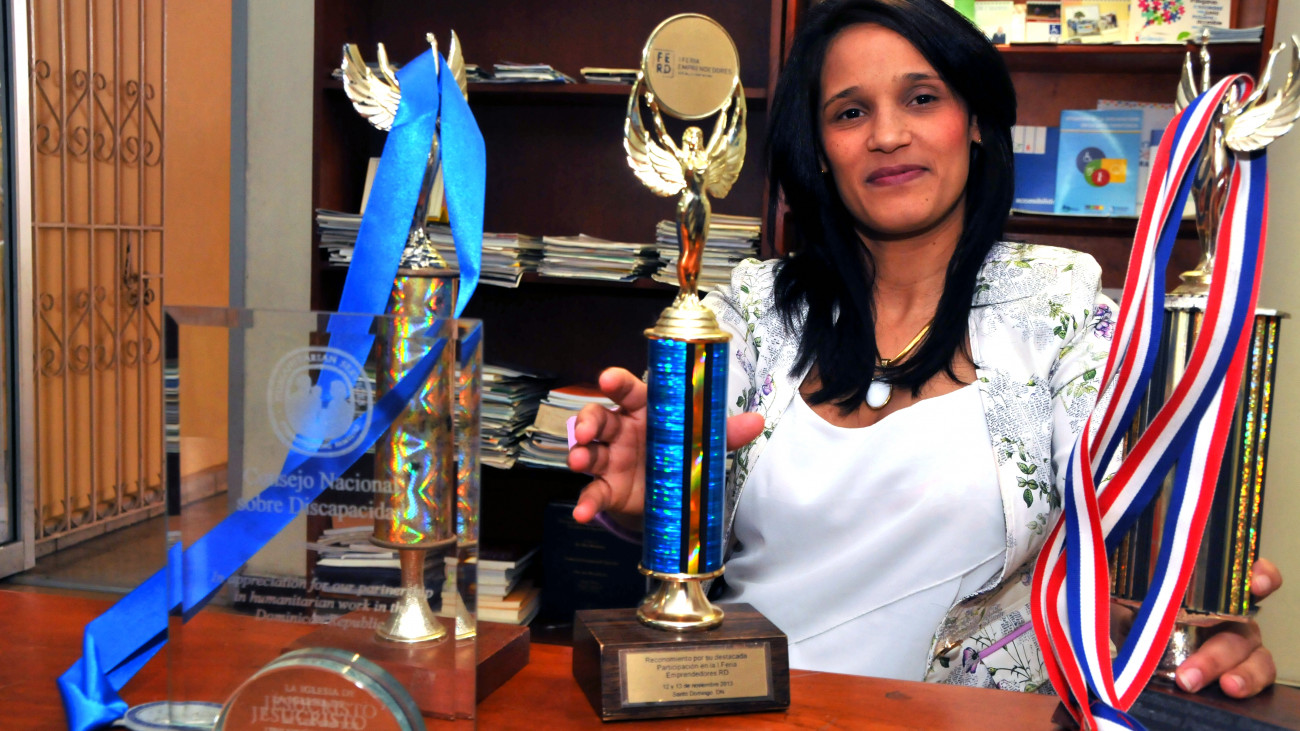Con orgullo Miguelina muestra el reconocimiento recibido por su destacada participación en la Primera Feria Emprendedores del República Dominicana, celebrada el 12 y 13 de noviembre de 2014, en esta ciudad, entre otros trofeos.