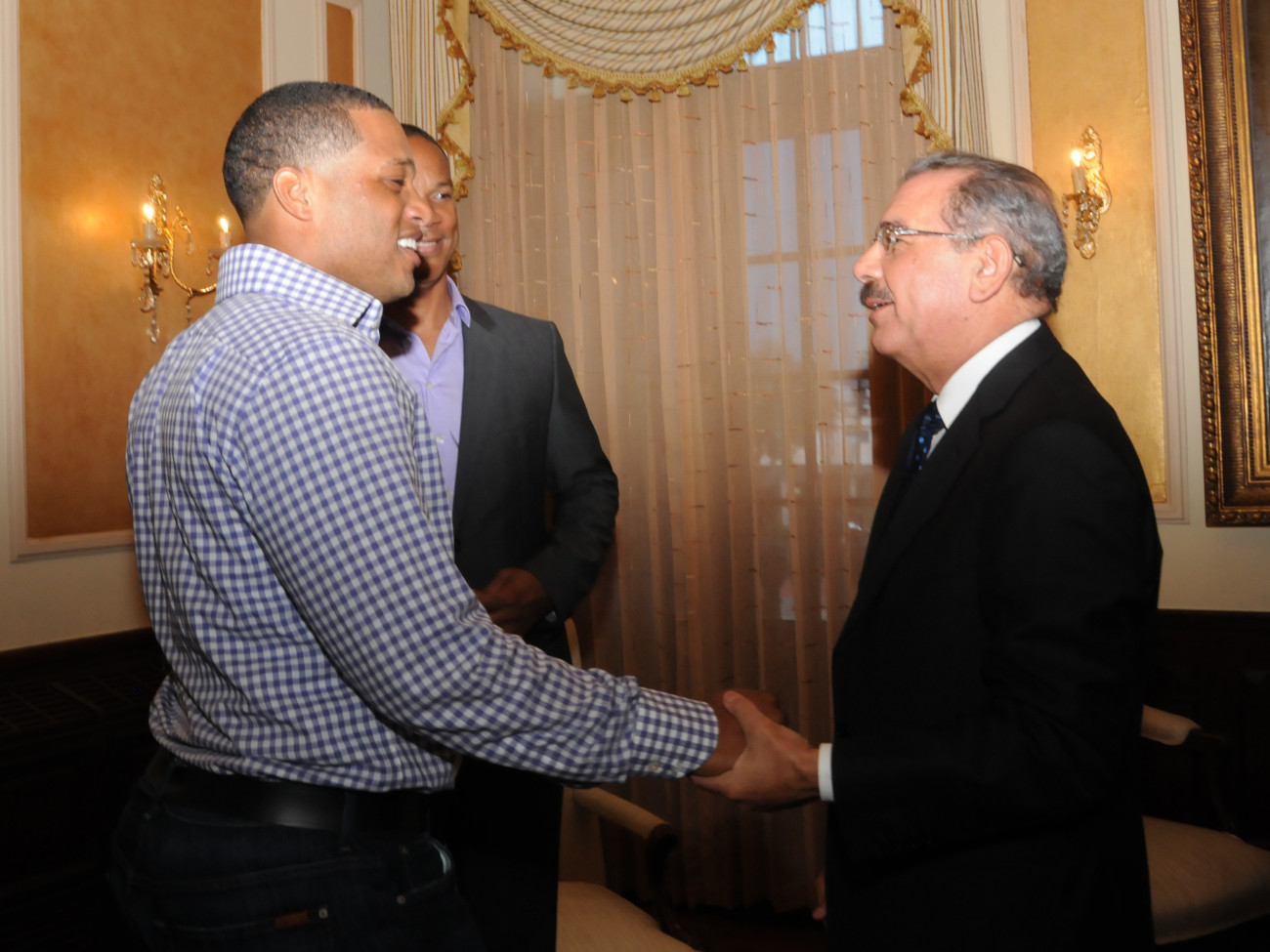 El presidente de la República, Danilo Medina felicitó a Robinson Canó, ganador del premio Jugador Más Valioso del Clásico Mundial de Béisbol 2013, evento en el que, de forma invicta, el equipo de República Dominicana fue el campeón. Observa, Moisés Alou.