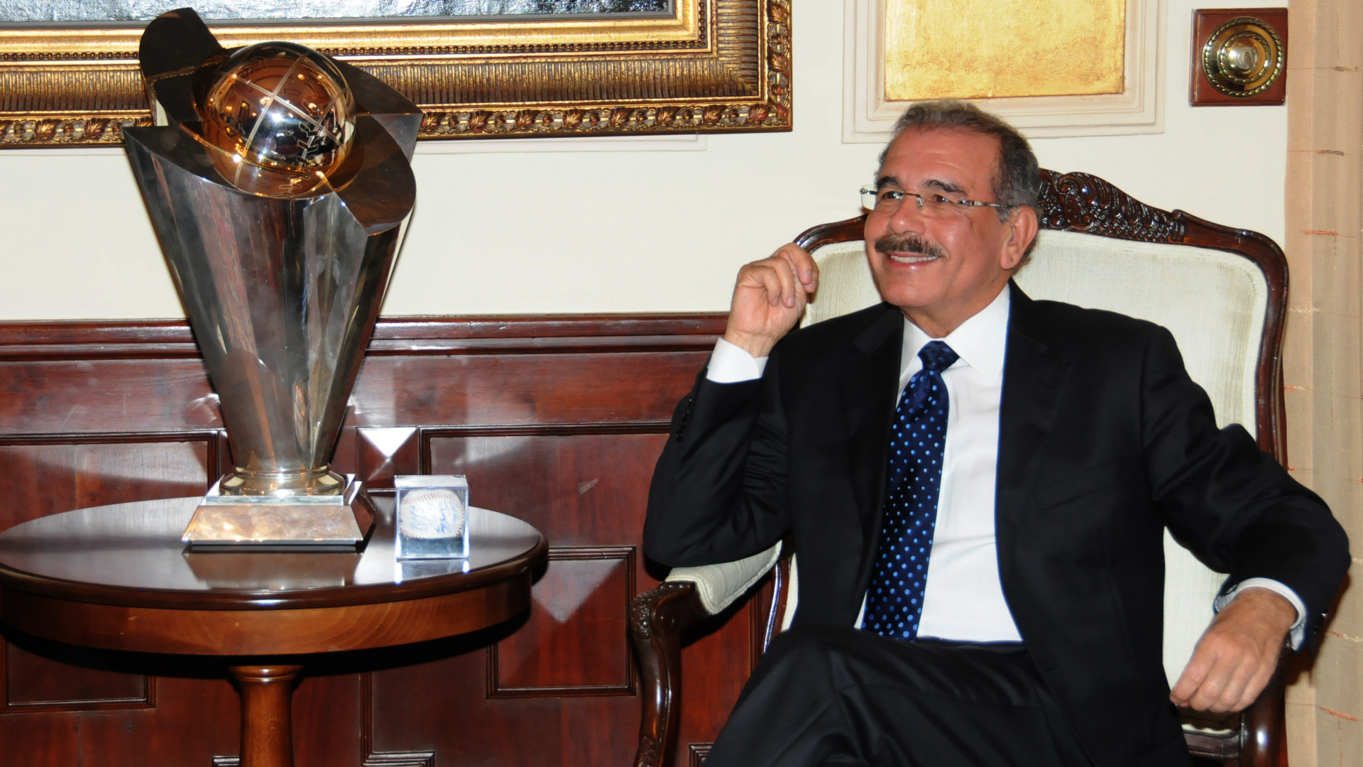 Danilo Medina, presidente de la República, muestra una sonrisa tras recibir de manera simbólica el trofeo de campeón del equipo dominicano en el Clásico Mundial de Béisbol de 2013 y una bola de béisbol autografiada por todos los peloteros criollos que participaron en el evento.