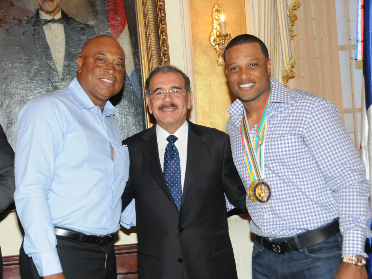 El presidente Danilo Medina sonríe junto a Robinson Canó, quien exhibe en compañía de su padre, José Canó, sus medallas como Jugador Más Valioso del Clásico Mundial de Béisbol 2013 y miembro del equipo campeón de República Dominicana.