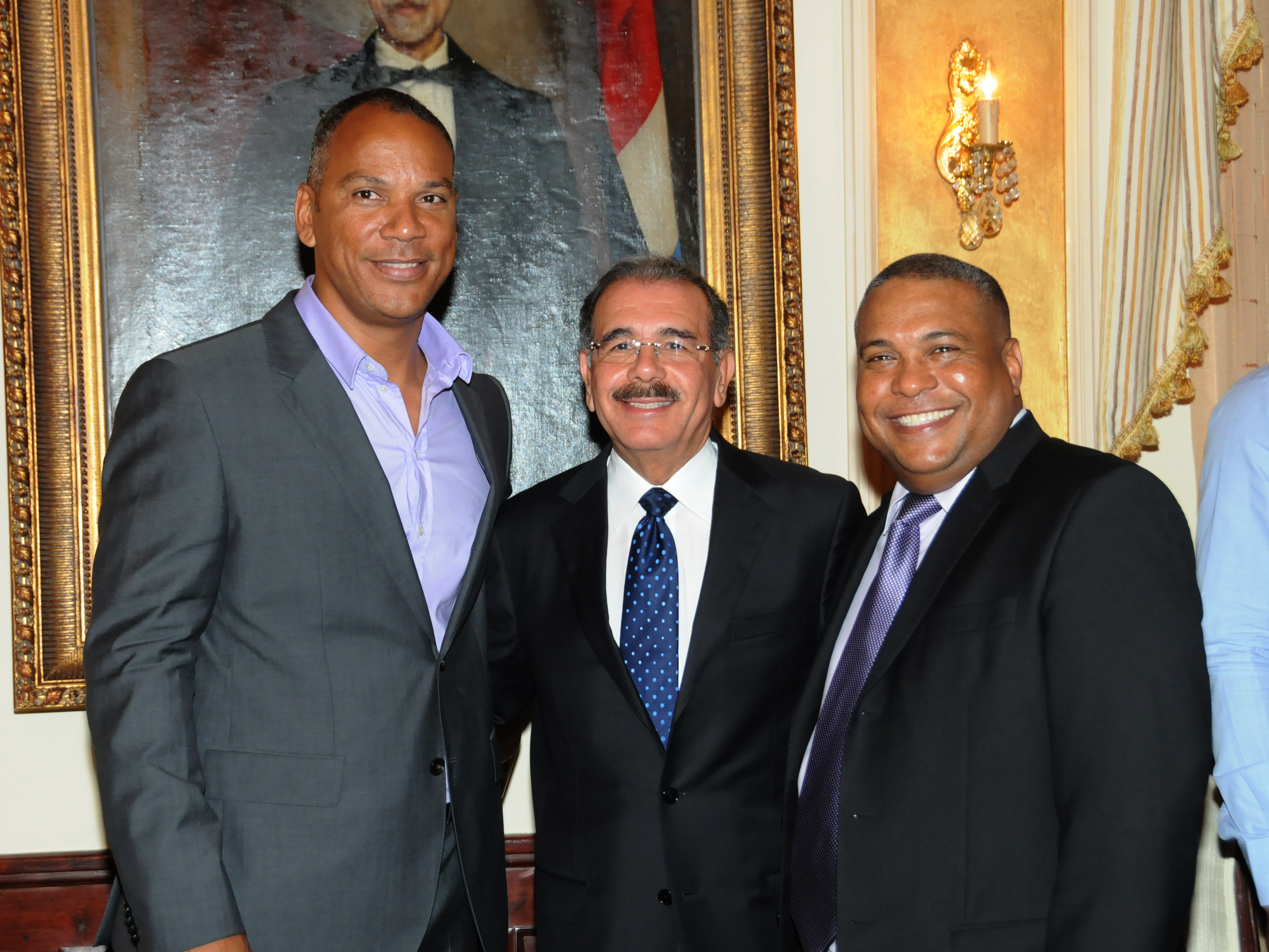 Danilo Medina, presidente de la República, junto a Moisés Alou, gerente general del equipo dominicano; y Héctor -Tito- Pereyra, presidente de la Federación Dominicana de Béisbol.