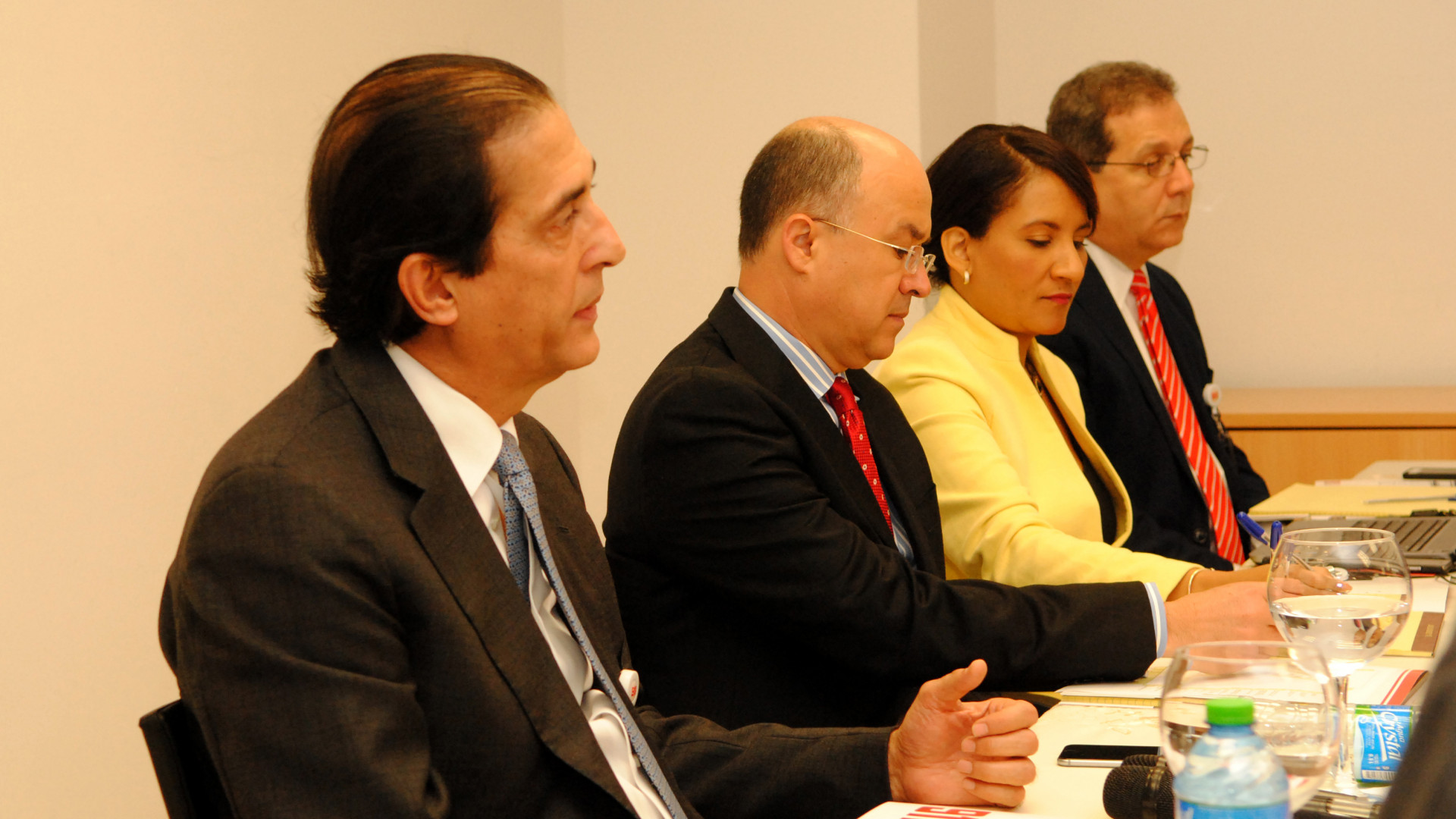 Ministro de la Presidencia, Gustavo Montalvo; procurador general, Francisco Domínguez Brito; viceministra de la Presidencia y vocera del 911, Zoraima Cuello, y el director ejecutivo del sistema, Dalvert Polanco, durante el encuentro.