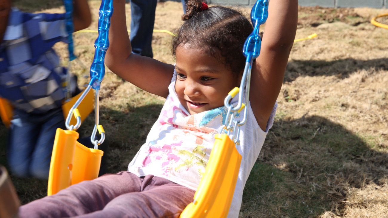 Otra niña con carita feliz al disfrutar de su nueva Estancia Infantil Juan Pablo Duarte, en la comunidad Villa Central, Barahona, inaugurada hoy en acto encabezado por el presidente Danilo Medina.