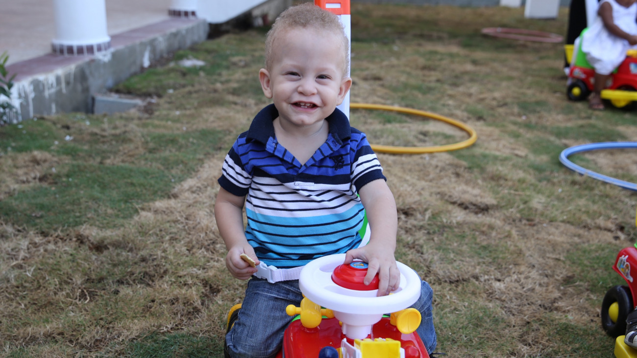 Niño con carita feliz al disfrutar de su nueva Estancia Infantil Juan Pablo Duarte, en la comunidad Villa Central, Barahona, inaugurada hoy en acto encabezado por el presidente Danilo Medina.